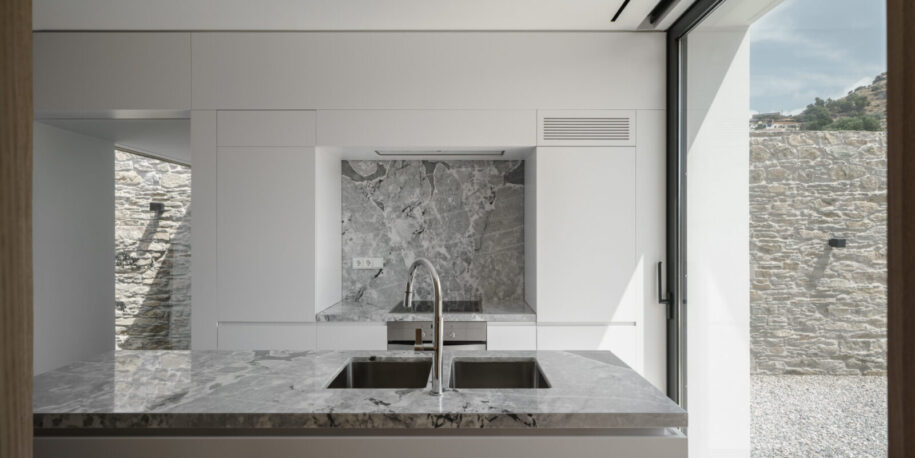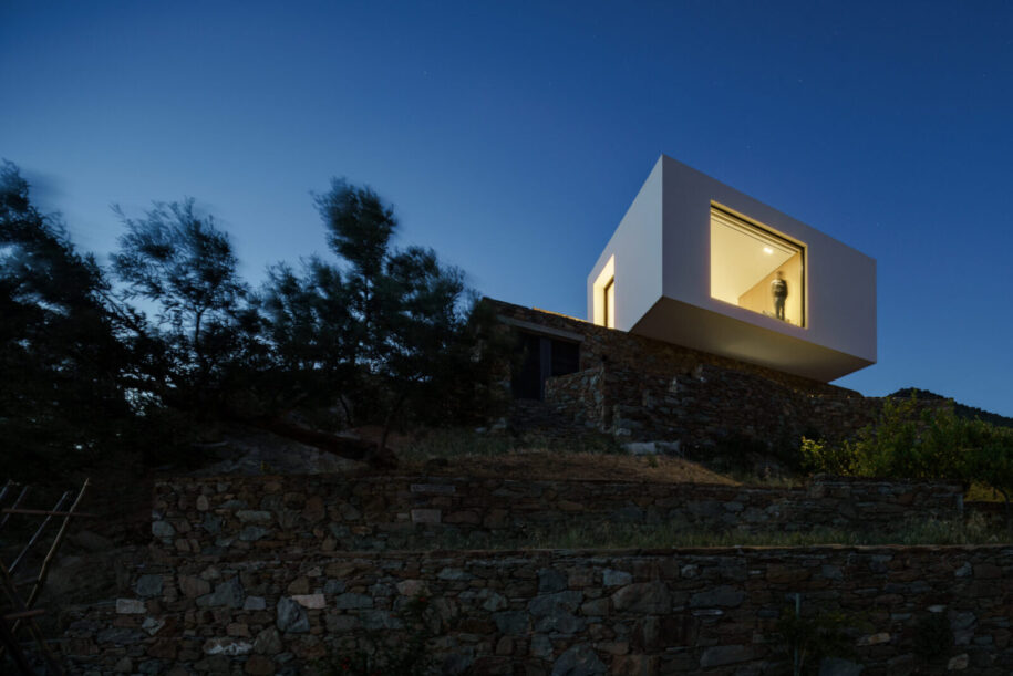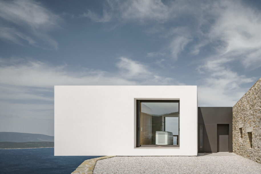 Το αρχιτεκτονικό γραφείο gkotsis serafimidou architects σχεδίασε την Κατοικία στο Μαρμάρι στην Εύβοια ανακατασκευάζοντας το πέτρινο κτίριο, που προϋπήρχε στο κτήμα, με σεβασμό στην αρχική του δομή, προσθέτοντας, ταυτόχρονα, μια προέκταση του χώρου κατοίκησης που οργανώνεται ως ένα λευκό κουτί το οποίο «προσγειώνεται» στο περιβάλλον βραχώδες τοπίο σαν ένα ξένο αντικείμενο που ισορροπεί πάνω από τη θάλασσα, στο πιο απότομο σημείο του οικοπέδου, δημιουργώντας μία χαρακτηριστική αιώρηση του όγκου του.