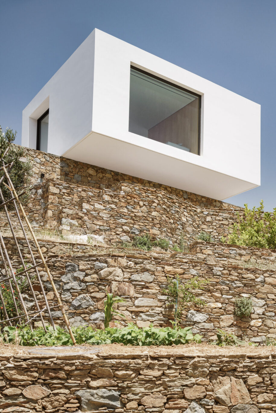 Παράλληλα, σχεδιάζεται εκ νέου ένα λευκό κουτί, που σχεδόν σαν ξένο αντικείμενο «προσγειώνεται» στο τοπίο και ισορροπεί στη μία άκρη, στο πιο απότομο σημείο του οικοπέδου, δημιουργώντας μία χαρακτηριστική αιώρηση.