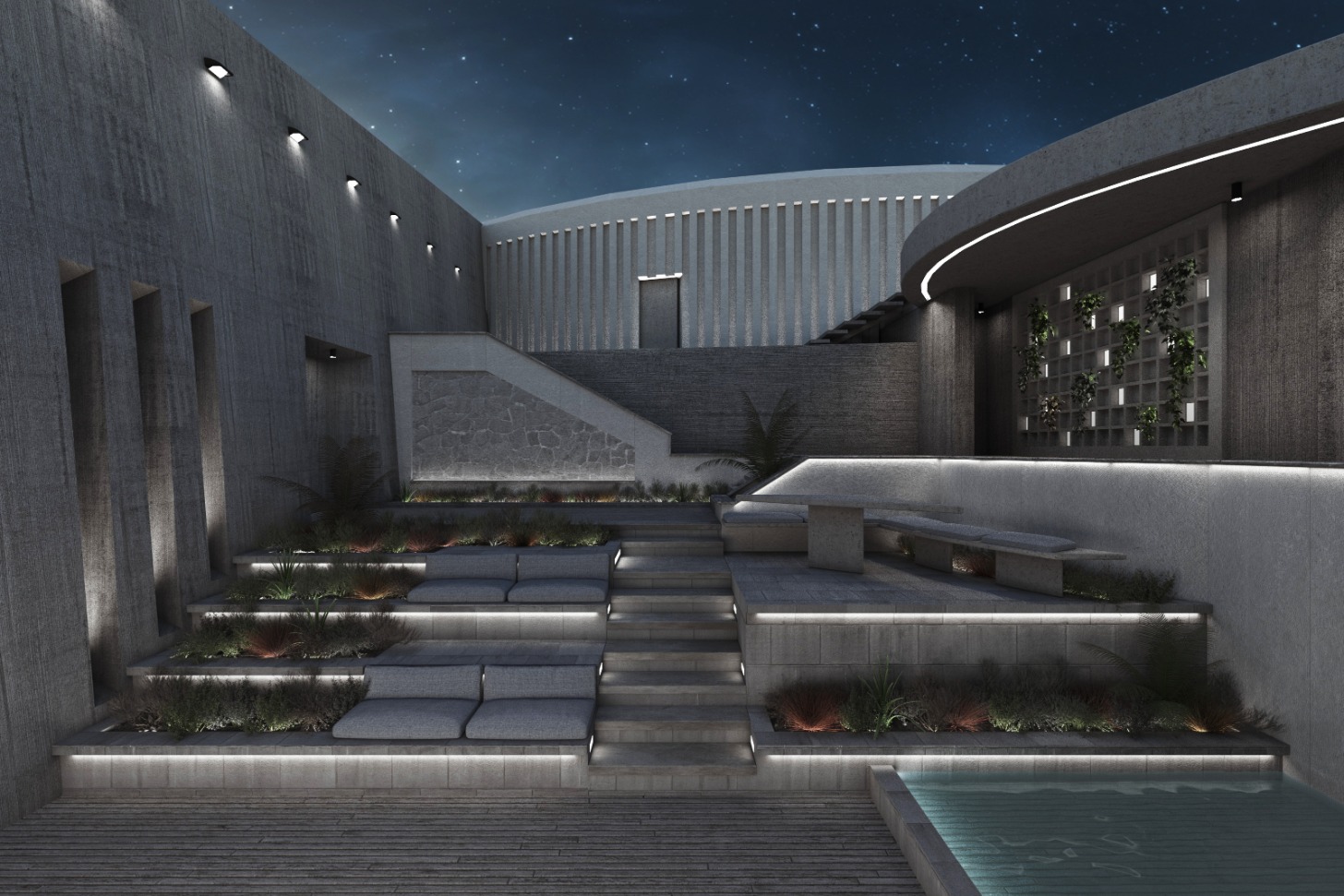 Ο επισκέπτης μπαίνει στο σπίτι από το υψηλότερο σημείο του αιθρίου – το οποίο ακολουθεί το επικλινές ανάγλυφο έδαφος, με επίπεδα και πεζούλες νησιώτικης έμπνευσης – για να οδηγηθεί στους επιμέρους χώρους του σπιτιού και, τελικά, στην καθηλωτική θέα. Ωστόσο, το αίθριο δεν είναι αποκομμένο, παρά αποτελεί ζωτικό χώρο διαβίωσης της κατοικίας, όπως ακριβώς συμβαίνει και με το βατό δώμα-πισίνα. Όταν κανείς βρίσκεται στο αίθριο, βλέπει να αποκαλύπτεται μπροστά του το σύνολο της οργάνωσης του σπιτιού, ενώ το ίδιο το αίθριο, φιλικό για κατοίκους και επισκέπτες, δίνει στην ουσία στην υπαίθρια διαβίωση την ίδια αξία με την κλειστή – όπως περιμένει κανείς από μια εξοχική κατοικία.