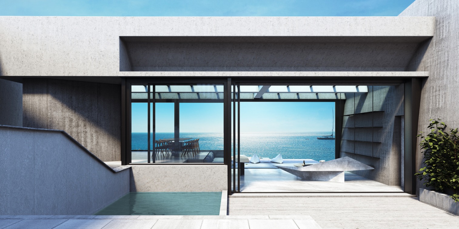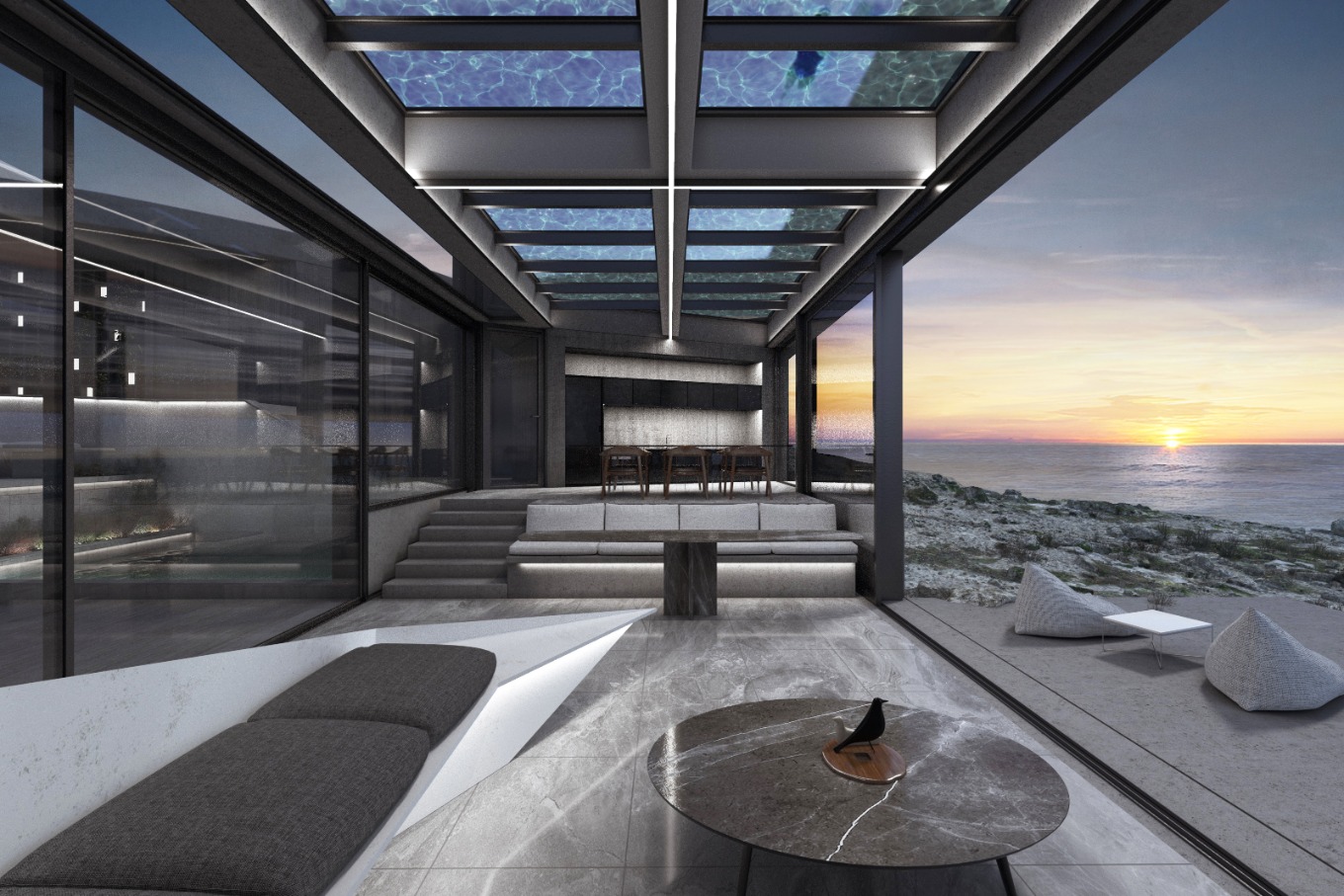 Η εντυπωσιακή πισίνα είναι έτσι σχεδιασμένη ώστε να αποτελεί την οπτική συνέχεια της θάλασσας, ενώ συγχρόνως λειτουργεί ως παρατηρητήριο-«belvedere», έτσι όπως η δεξαμενή της είναι τοποθετημένη στην οροφή του σπιτιού. Όταν κανείς βρίσκεται στην είσοδο του αιθρίου, φαίνεται σαν η δεξαμενή του νερού της πισίνας να είναι ένα με τη θάλασσα. Παράλληλα, καθώς ο πυθμένας της πισίνας αποτελεί την οροφή του κεντρικού χώρου, δημιουργείται ένας ιδιαίτερος φυσικός φωτισμός που ρέει, δεν είναι ποτέ σταθερός μέσα στην ημέρα, δημιουργώντας μια σουρεαλιστική ατμόσφαιρα που δίνει την αίσθηση ότι το μέσα και το έξω ενοποιούνται…