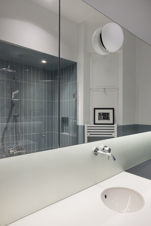 Στο μπάνιο, γαλαζοπράσινες αποχρώσεις και καθαρές γραμμές δημιουργούν μια ατμόσφαιρα εμπνευσμένη από πισίνα, με vintage πορσελάνινα αξεσουάρ να λειτουργούν ως διακριτικές αναφορές στο παρελθόν.