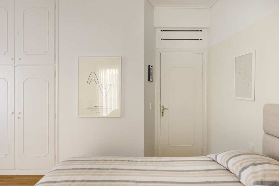 Στα υπνοδωμάτια, οι παλιές ντουλάπες ανανεώθηκαν και συνδυάστηκαν με vintage έπιπλα της ιδιοκτήτριας και φωτιστικά της Artemide, προσφέροντας έναν ζεστό, φυσικό και λειτουργικό χώρο.