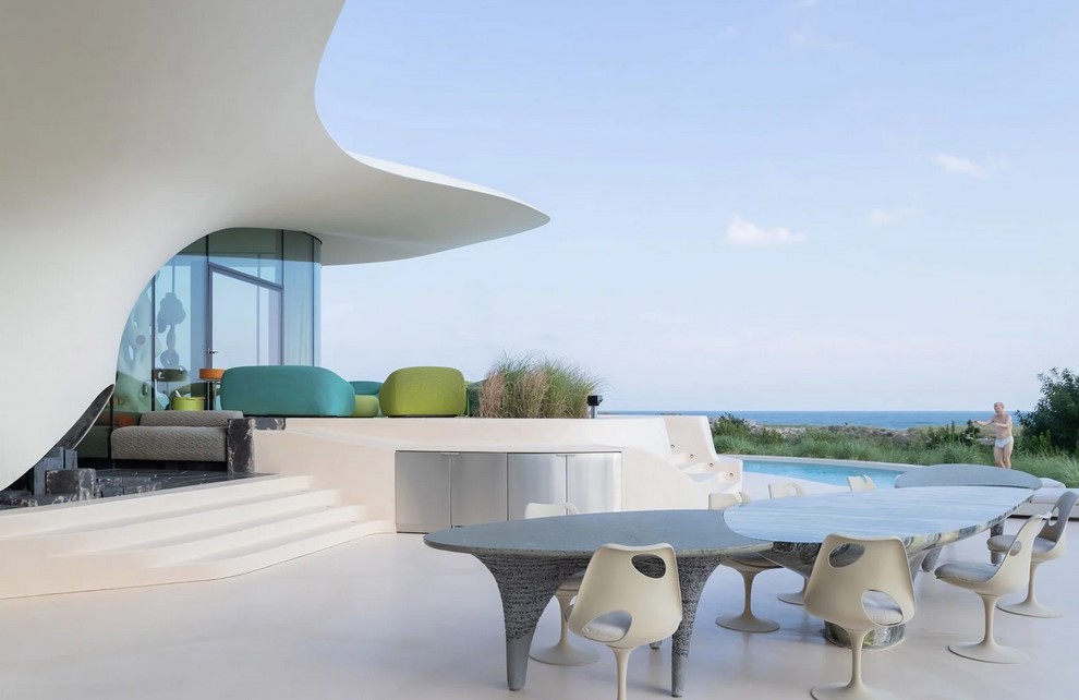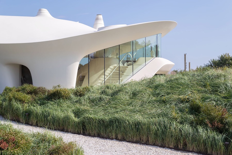 Χτισμένο επάνω στις αμμοθίνες του Ατλαντικού, το σπίτι αιωρείται ανάμεσα σε καμπύλες από λευκό και γυαλί. Τίποτα δεν είναι αυστηρό, τίποτα δεν είναι ευθύ. Το μέσα και το έξω γλιστρούν το ένα μέσα στο άλλο, σαν να μην υπάρχει διάκριση.