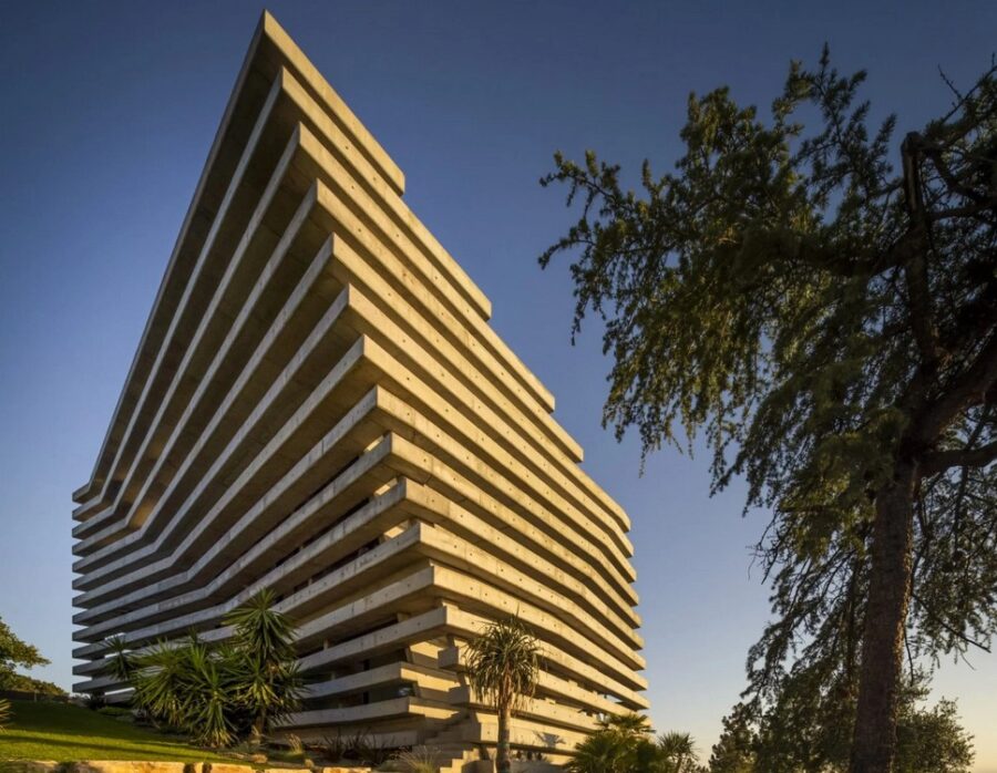 Η φόρμα του -καμπυλωτή, κοφτή, στρίβει περίεργα αλλά αρχιτεκτονικά στρατηγικά- δημιουργεί έναν όγκο που δείχνει αδιαπέραστος. Και όμως, πίσω από τις στιβαρές επιφάνειες κρύβονται μακριές, επιμήκεις τζαμαρίες, που επιτρέπουν στο φως να γλιστρά αθόρυβα μέσα.