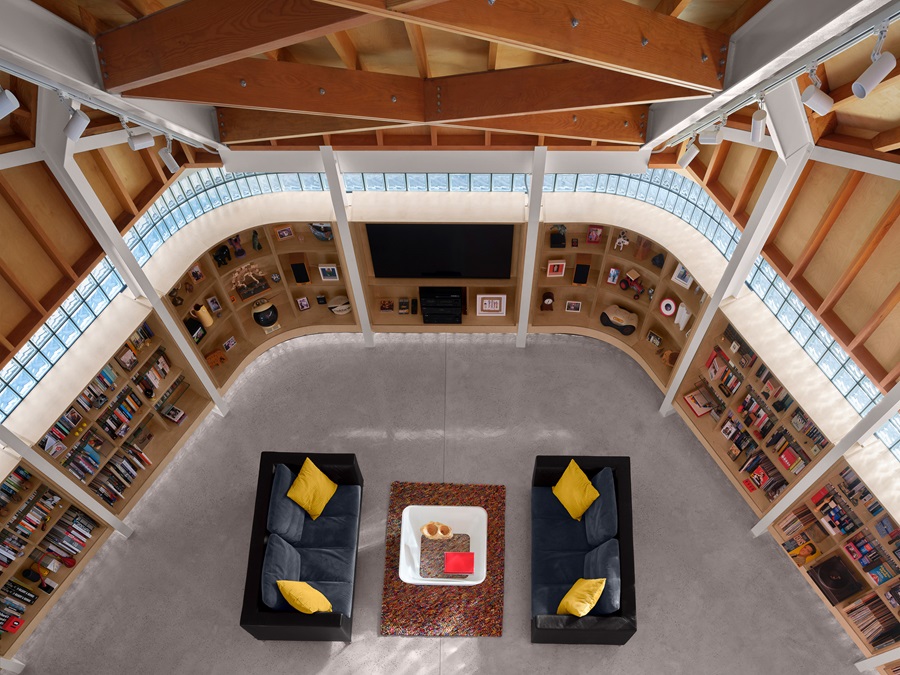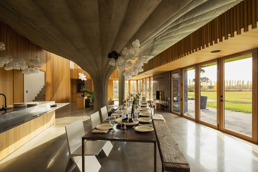 Η μεταλλική στέγη του, καμπυλωτή σαν καβούκι αρμαντίλλου, δίνει μια σχεδόν βιομηχανική όψη. Όμως μόλις περάσεις το κατώφλι, τα πάντα αλλάζουν: ένα εσωτερικό ψηλό αίθριο γεμίζει με φως τον κύριο χώρο διαβίωσης, δημιουργώντας έναν ανοιχτό υπέροχο κόσμο.