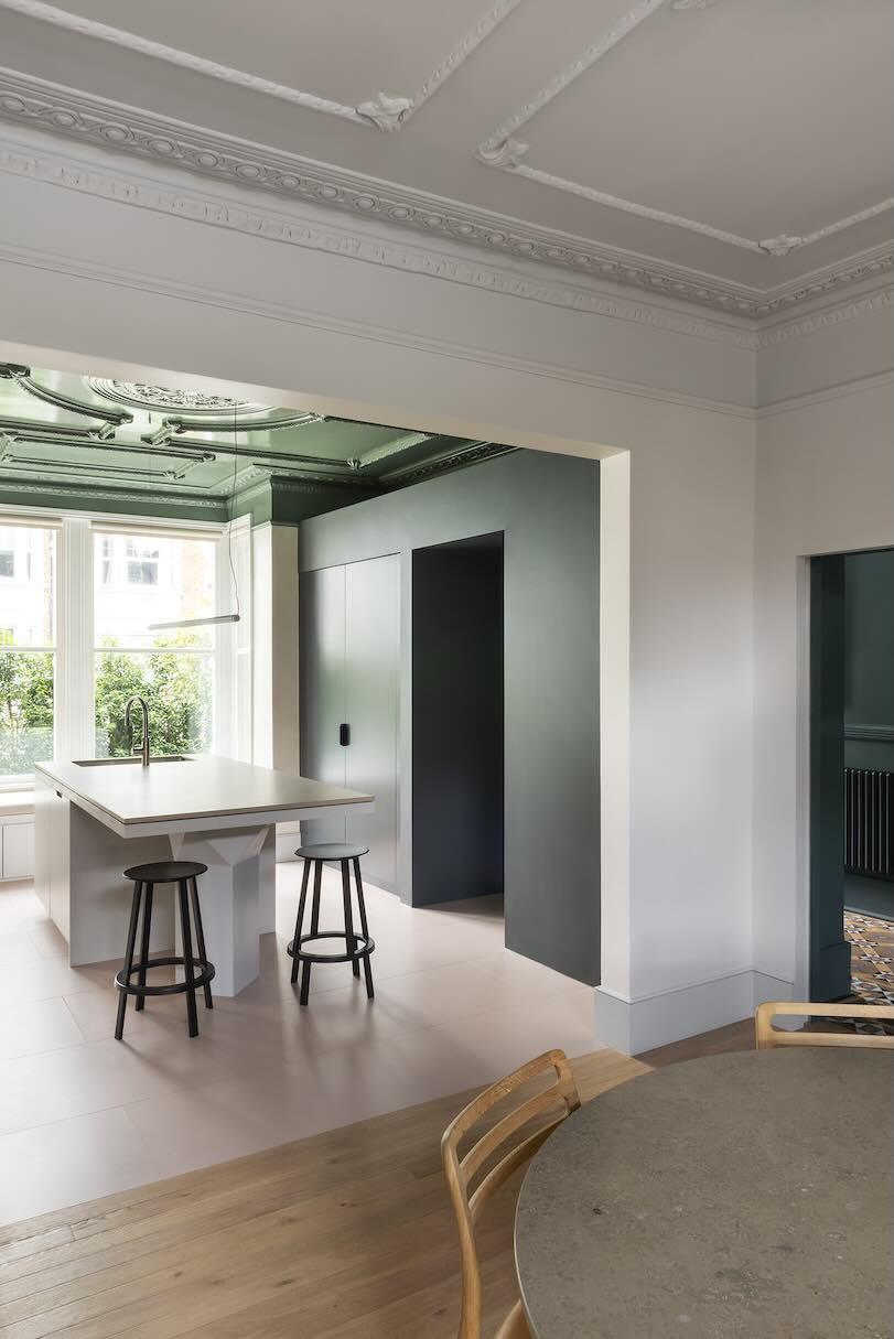 Παράλληλα, τα βικτωριανά πλακάκια, τα γύψινα ταβάνια και τα ξύλινα πατώματα έχουν αποκατασταθεί με σεβασμό, προσφέροντας στο σύγχρονο design μια διαχρονική βάση.