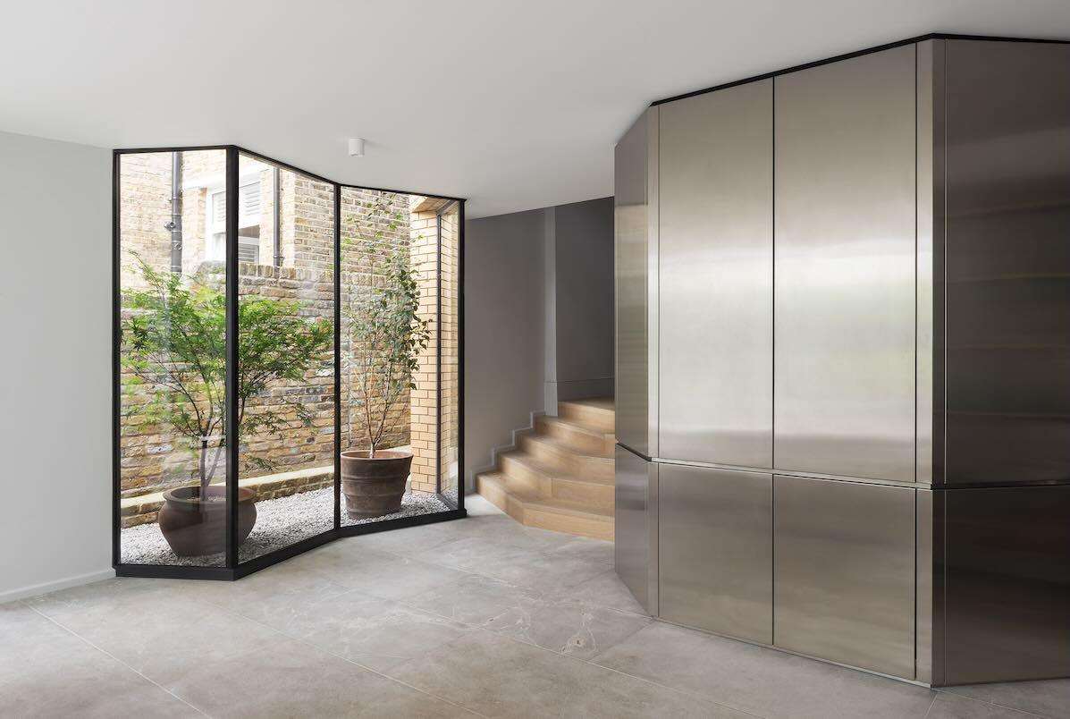 Στο πίσω μέρος, η νέα επέκταση μοιάζει να λούζεται από φυσικό φως. Το βλέμμα πέφτει στον γλυπτικό όγκο από ανοξείδωτο ατσάλι: μια statement παρέμβαση που αντανακλά τις γραμμές του χώρου. Λειτουργεί ως λειτουργικός πυρήνας και κρύβει με ευρηματικότητα WC και storage.