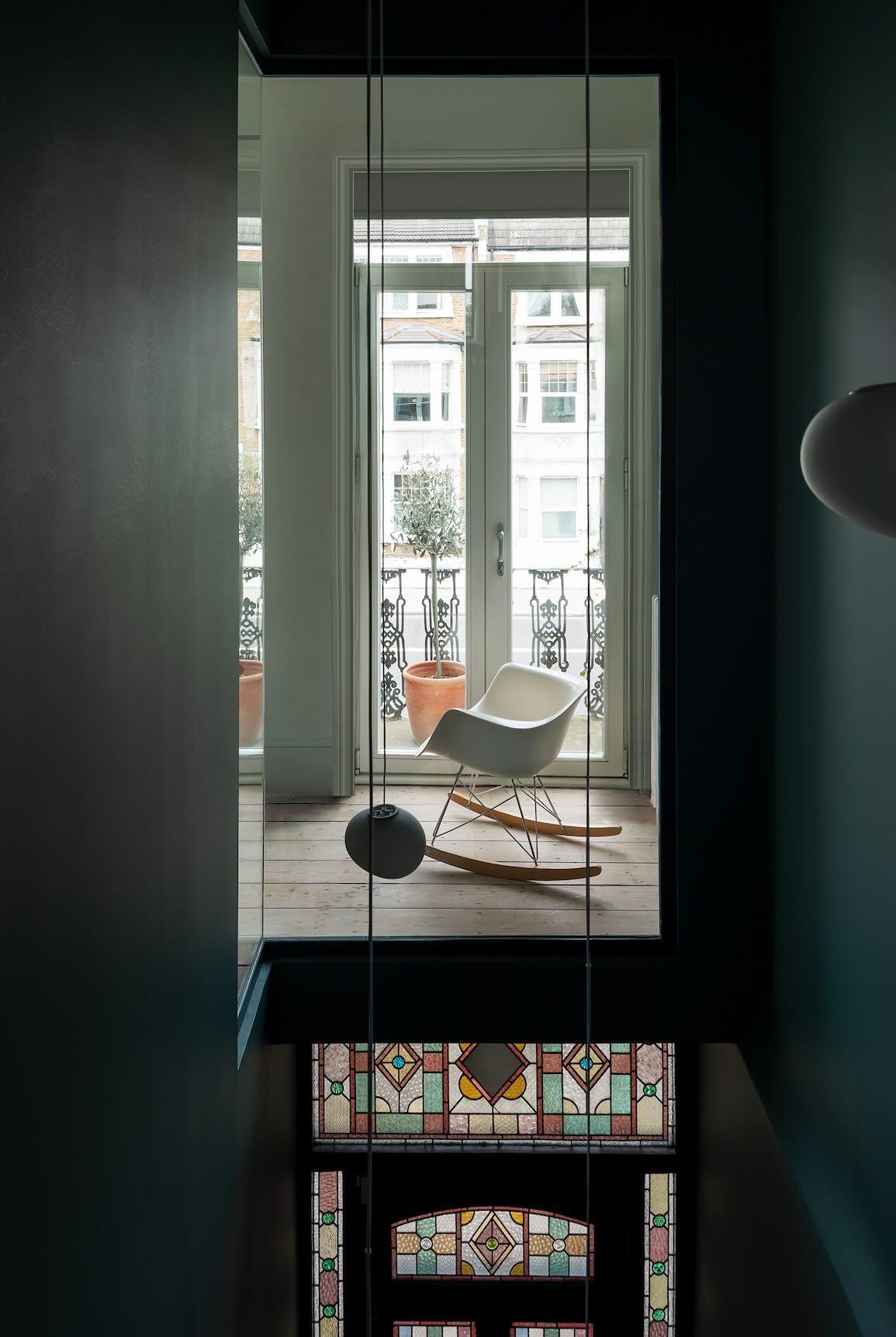 Το μπροστινό δωμάτιο φιλοξενίας διαθέτει πλήρους ύψους εσωτερικά υαλοστάσια, επιτρέποντας στο φως να διαπερνά τους ορόφους και να δημιουργεί μια χορογραφία σκιάς και κίνησης.
