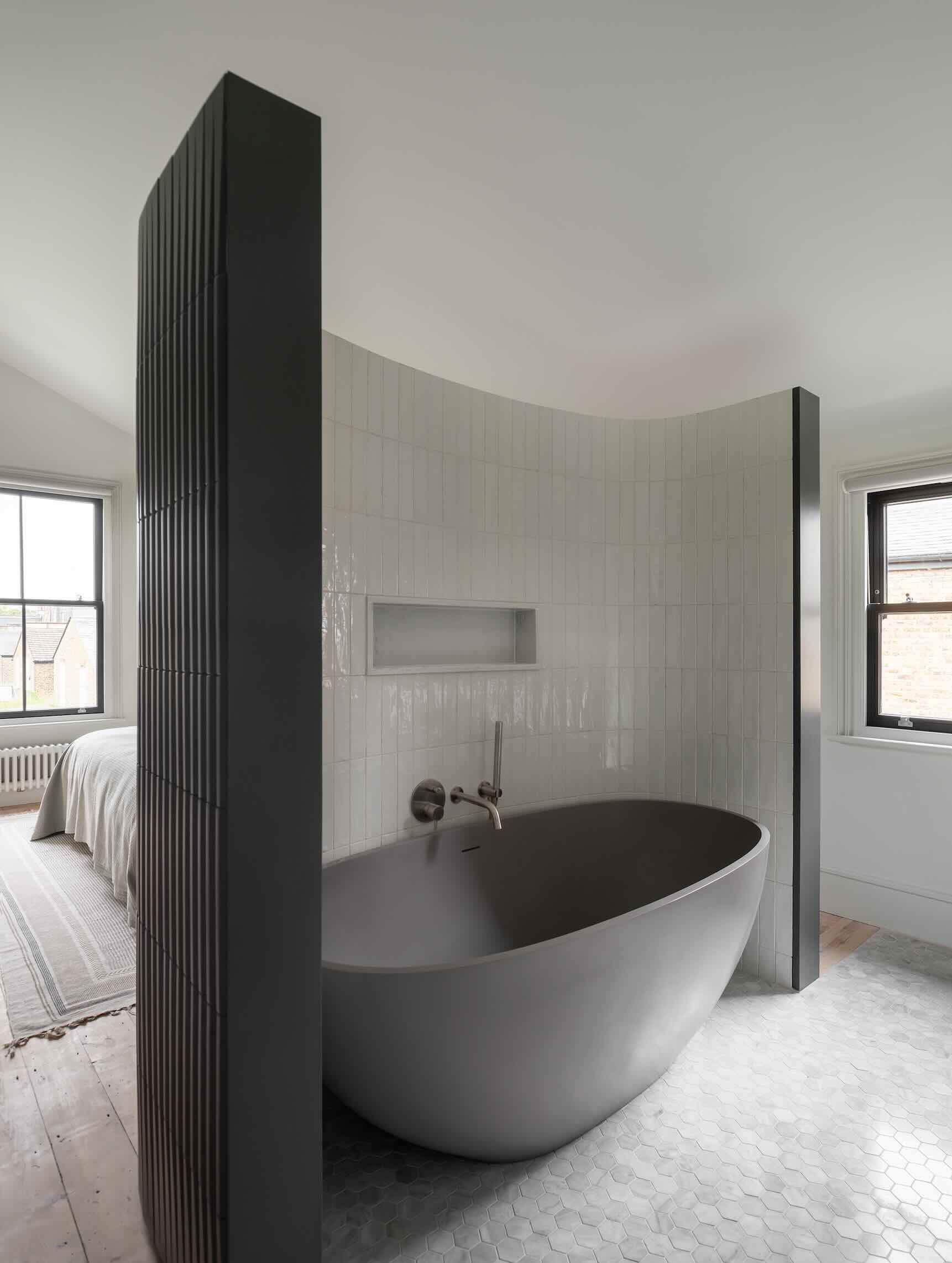 Στους επάνω ορόφους, η χρωματική παλέτα αλλάζει και πάλι ρυθμό. Η σκάλα σε Klein Blue μετατρέπεται σε αρχιτεκτονικό highlight, ενώ το master bedroom πλαισιώνεται από καμπύλα χωρίσματα, ανάγλυφες επιφάνειες και μια ελεύθερη μπανιέρα που θυμίζει boutique suite.
