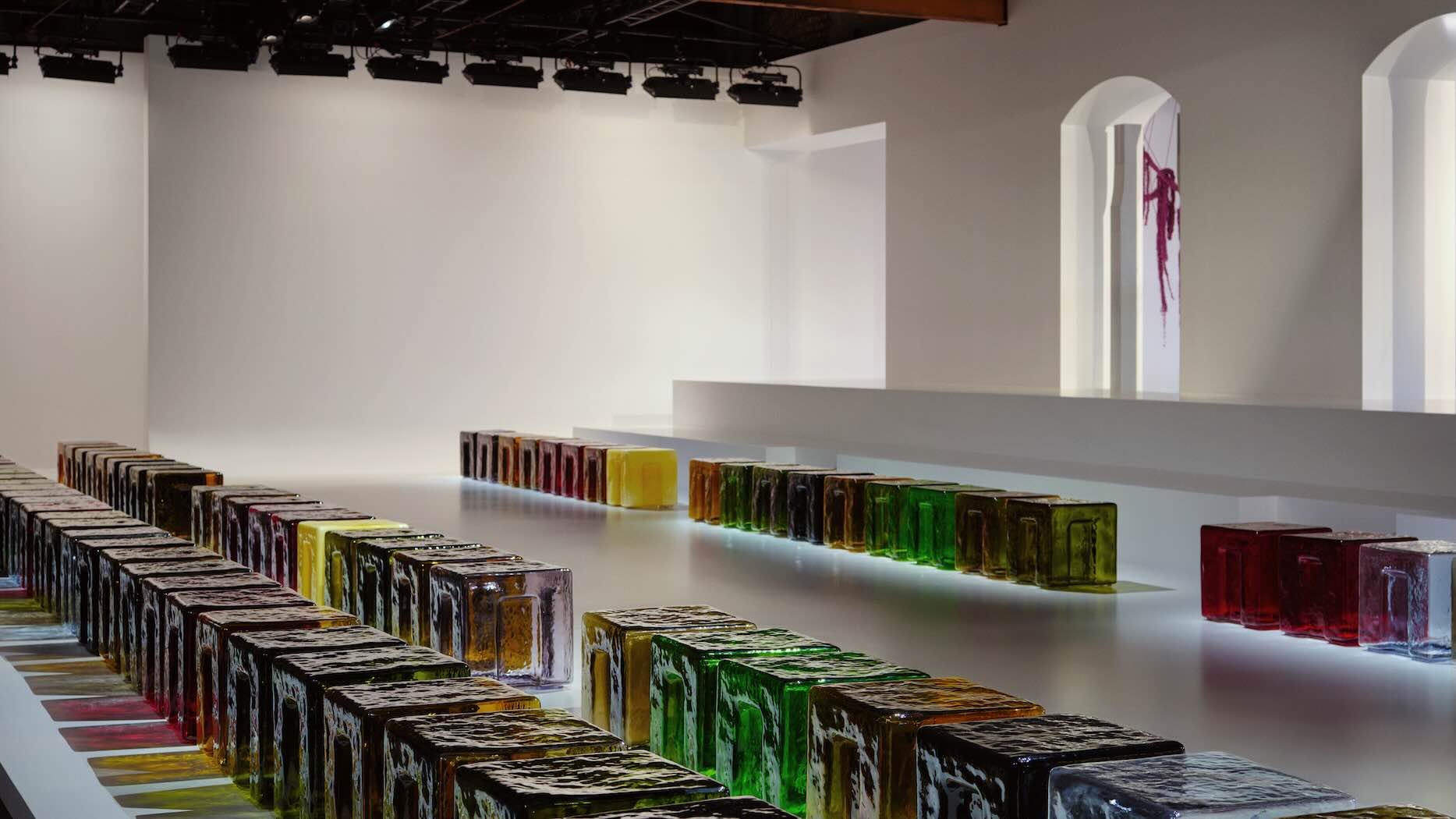 Η επιλογή του γυαλιού δεν είναι μόνο αισθητική αλλά και λειτουργική: οι συμμετρικές εσοχές στις πλευρές ενισχύουν τη μηχανική αντοχή κάθε κύβου. Το ειδικό υφή και η παλέτα από δέκα αποχρώσεις δημιουργούν ρευστά παιχνίδια φωτός και χρώματος στον λευκό χώρο, τονίζοντας τη διαφάνεια και τη φυσική λάμψη του γυαλιού.