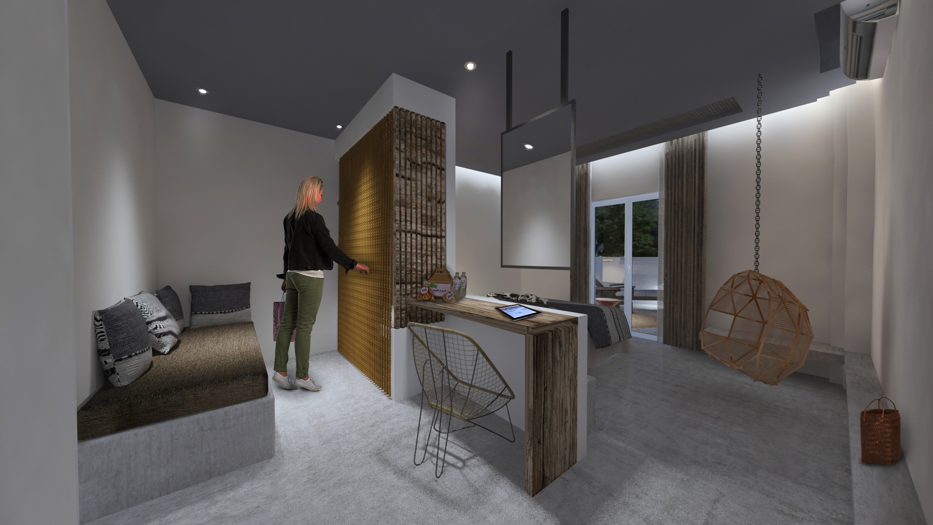 Στα δωμάτια κυριαρχούν απαλά χρώματα (λευκό, γκρι, ανοικτές καφέ αποχρώσεις, παστέλ χρώματα και γήινα), τα φυσικά υλικά (πέτρα, ξύλο, δέρμα, σχοινιά, λινάτσα) και ο λιτός σχεδιασμός. Τα δωμάτια διαθέτουν μεγάλα παράθυρα με ιδιωτική βεράντα με κήπο και θέα. Ο χώρος πρωινού – φαγητού με το bar αναπτύσσονται εσωτερικά και εξωτερικά δημιουργώντας ένα ανοικτό περιβάλλον με πολλές χρήσεις και καλωσορίζουν τους επισκέπτες να το απολαύσουν. Σε όλους τους κοινόχρηστους χώρους έχει δοθεί έμφαση στην φύτευση και ανάπτυξη ελληνικών φυτών με σκοπό την προώθηση της ελληνικής φύσης.