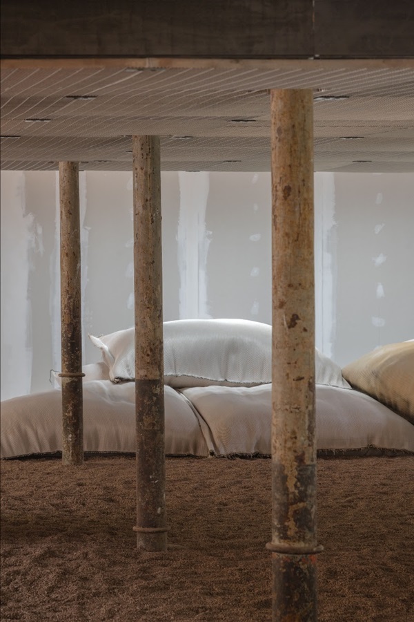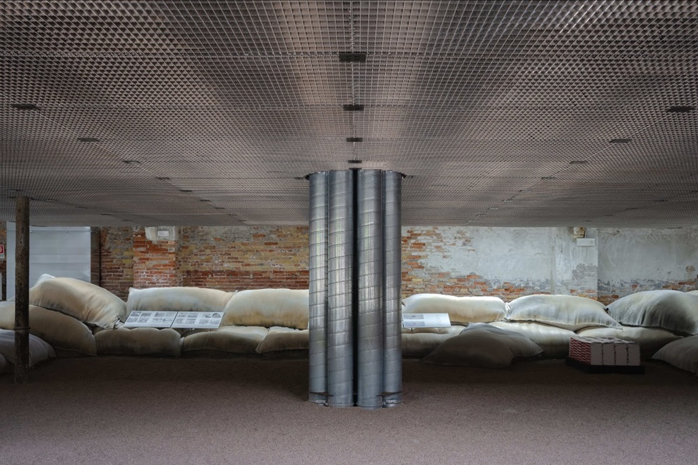 Πέρα από την τεχνική πρόταση, το περίπτερο επιλέγει να μιλήσει για την εργασία κάτω από ακραίες θερμοκρασίες. Μια αφαιρετική εγκατάσταση από σακιά με άμμο και χώμα παραπέμπει στο πεδίο της χειρωνακτικής εργασίας στις χώρες του Κόλπου. Εκεί όπου οι εργάτες χτίζουν κάτω από 50°C και η αρχιτεκτονική καλείται να προστατεύσει όχι μόνο την αισθητική, αλλά την ανθρώπινη αξιοπρέπεια.