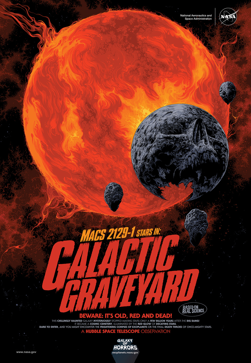 Αυτήν τη φορά, όμως, η διάθεση είναι κάπως πιο… σκοτεινή. Οι αφίσες συνδυάζουν φανταστικές καλλιτεχνικές απεικονίσεις με επιστημονικά στοιχεία. Ομάδες καλλιτεχνών και επιστημόνων συνεργάζονται για αυτό το project από το 2014. Σε αυτήν τη συλλογή με τον Γαλαξία του Τρόμου, μπορούμε να δούμε τη σκοτεινή ύλη, μια θανατηφόρα έκρηξη ακτινοβολίας Γάμμα και ένα «γαλαξιακό νεκροταφείο», όπου η γέννηση των άστρων έχει παγώσει, λίγα μόλις δισεκομμύρια χρόνια μετά το Big Bang.