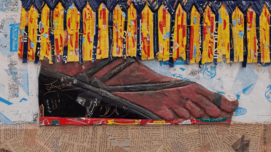 Μέσα από την ανάμιξη διαφορετικών υφών, έντονων χρωμάτων και ετερόκλητων υλικών -από εφημερίδες και χαρτιά περιτυλίγματος μέχρι συσκευασίες από προϊόντατης Μέσης Ανατολής- τα έργα του αποκτούν μια πολυεπίπεδη επιφάνεια, τόσο υλική όσο και νοηματική. Σαν να φτιάχνει μωσαϊκά από ίχνη και μνήμες, αποτυπώνει όχι μόνο ό,τι χάθηκε αλλά και το πώς χάθηκε: ποιοι το πήραν, ποιοι το εκμεταλλεύτηκαν, ποιοι το αγνόησαν.