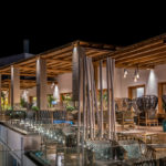 Η ψηλή είσοδος, η κεντρική βρύση ανάμεσα στο κεντρικό κτίριο και την πισίνα, και το υπαίθριο τζάκι είναι τα τρία σημεία αναφοράς στην περιοχή.