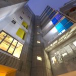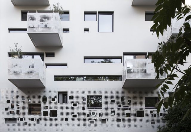 Η πολυκατοικία χαρακτηρίζεται από έντονα γραμμικά ανοίγματα, με διαφορετικά ύψη που άλλοτε κρύβουν και άλλοτε αποκαλύπτουν το τοπίο. Η πίσω όψη αντικρίζει την γκρίζα θέα του κέντρου. Το «φιλτράρισμα» είναι βασικό στοιχείο και εδώ επιτυγχάνεται με έγχρωμους υαλοπίνακες διαφορετικών χρωμάτων.