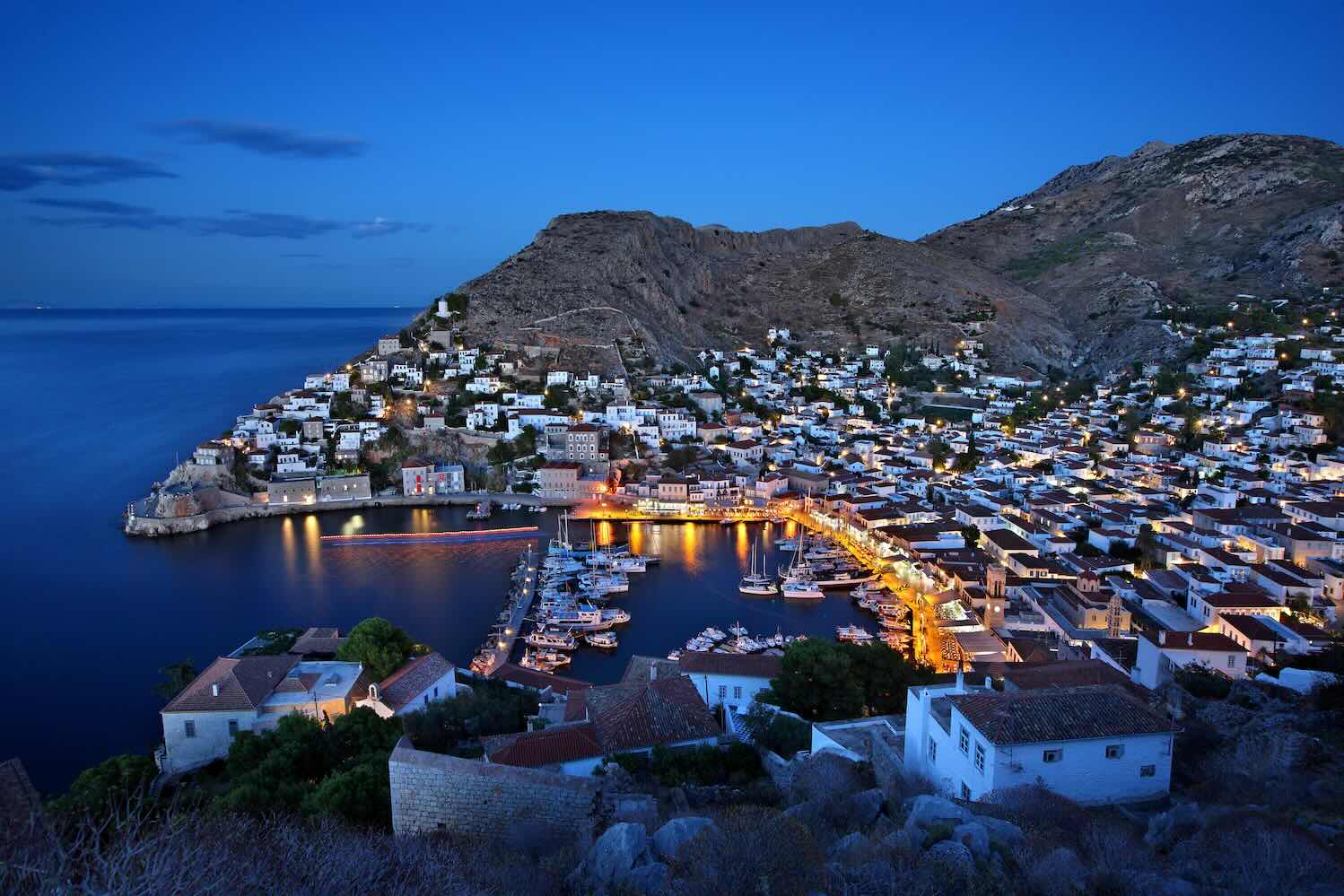 Panoramic night view of the port of Hydra town, Hydra island, Attica, Greece. Date taken:20.9.2016.