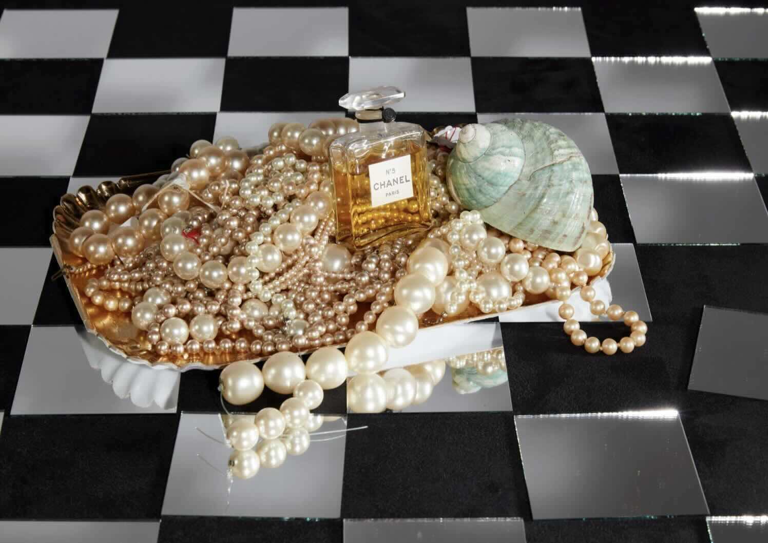 Κεντρική φωτογραφία: Chanel No 5 from 1924 on Tray of Pearls and Mirror Checkerboard, 2025, UV-cured pigment print, 50 x 70 inches (127 x 177.8 cm), Edition of 5 + 2 AP © Roe Ethridge Courtesy the artist and Gagosian