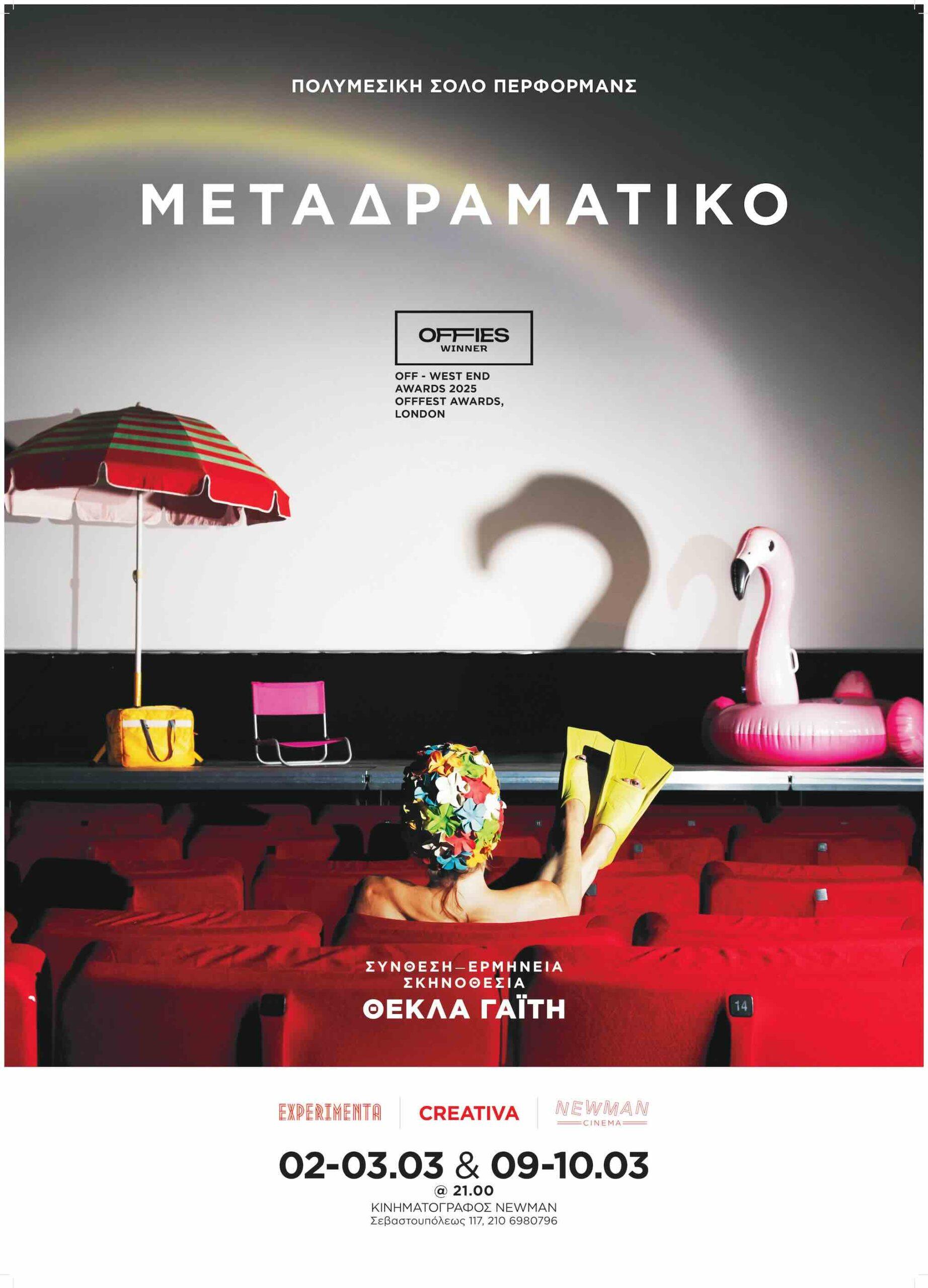 Υπάρχουν παραστάσεις που δεν προσπαθούν να σου πουν τι να σκεφτείς. Σε βάζουν απλώς μέσα σε έναν κόσμο και σε αφήνουν να χαθείς ή να βρεις κάτι δικό σου. Το ΜΕΤΑΔΡΑΜΑΤΙΚΟ, η πολυβραβευμένη σόλο περφόρμανς της Θέκλας Γαΐτη, αανήκει ακριβώς σε αυτή την κατηγορία. Τον Μάρτιο του 2026, για τέσσερις μόνο βραδιές, το έργο μεταφέρει τη σκηνική του εμπειρία στο Newman Cinema, σε μια εκδοχή φτιαγμένη ειδικά για κινηματογραφικό χώρο.
