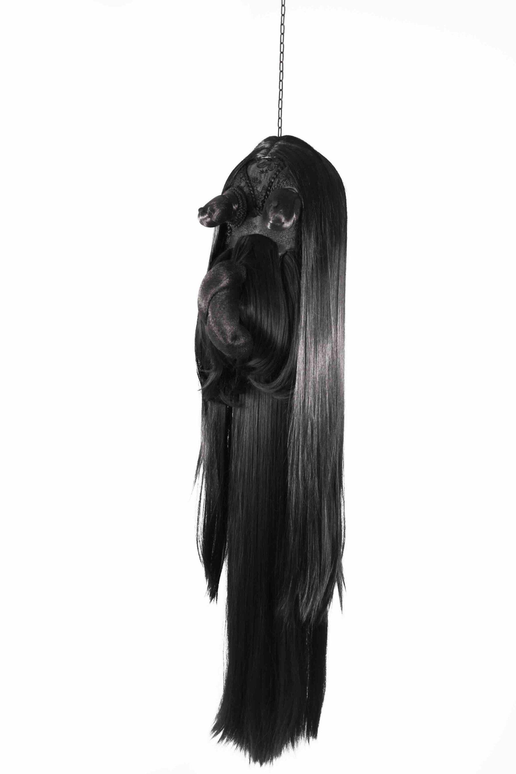 Τα γλυπτά της έκθεσης, φτιαγμένα από ύφασμα, μαλλιά, συνθετικά υλικά και περούκες, λειτουργούν ως τρισδιάστατες προεκτάσεις της ζωγραφικής της έρευνας. Μαλακά αλλά ταυτόχρονα αιχμηρά, θυμίζουν σώματα που έχουν φορεθεί, συναρμολογηθεί και τελικά εγκαταλειφθεί. Σαν κελύφη που μένουν πίσω μετά την εκπνοή. Η μάσκα, το υβριδικό σώμα και η αίσθηση του ανολοκλήρωτου κυριαρχούν, δημιουργώντας μορφές που δεν εξηγούνται αλλά υπάρχουν, ανοιχτές, εύθραυστες και δυναμικές.