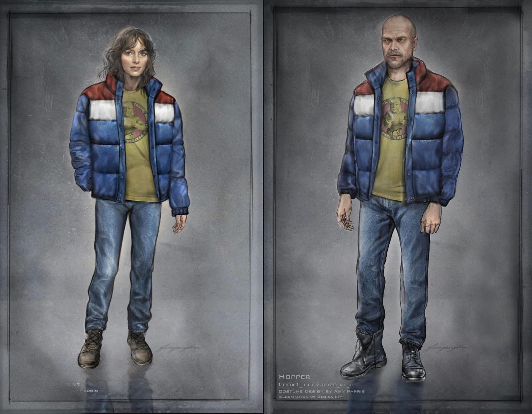 Ο κάθε χαρακτήρες ντύνεται με βάση την αφήγηση του. Είδαμε τον Eddie Munson με Levi’s τζιν, leather jacket, pins χειροποίητο Hellfire club T-shirt, την Eleven με ενδυματολογικές επιλογές που δηλώνουν τη σύγχυση και κρίση ταυτότητας ανά τις σεζόν. Easter eggs να κρύβονται στις στολές των Robin και Steve όπως για παράδειγμα το Hawk pin προς τιμή της ηθοποιού Maya Hawke.