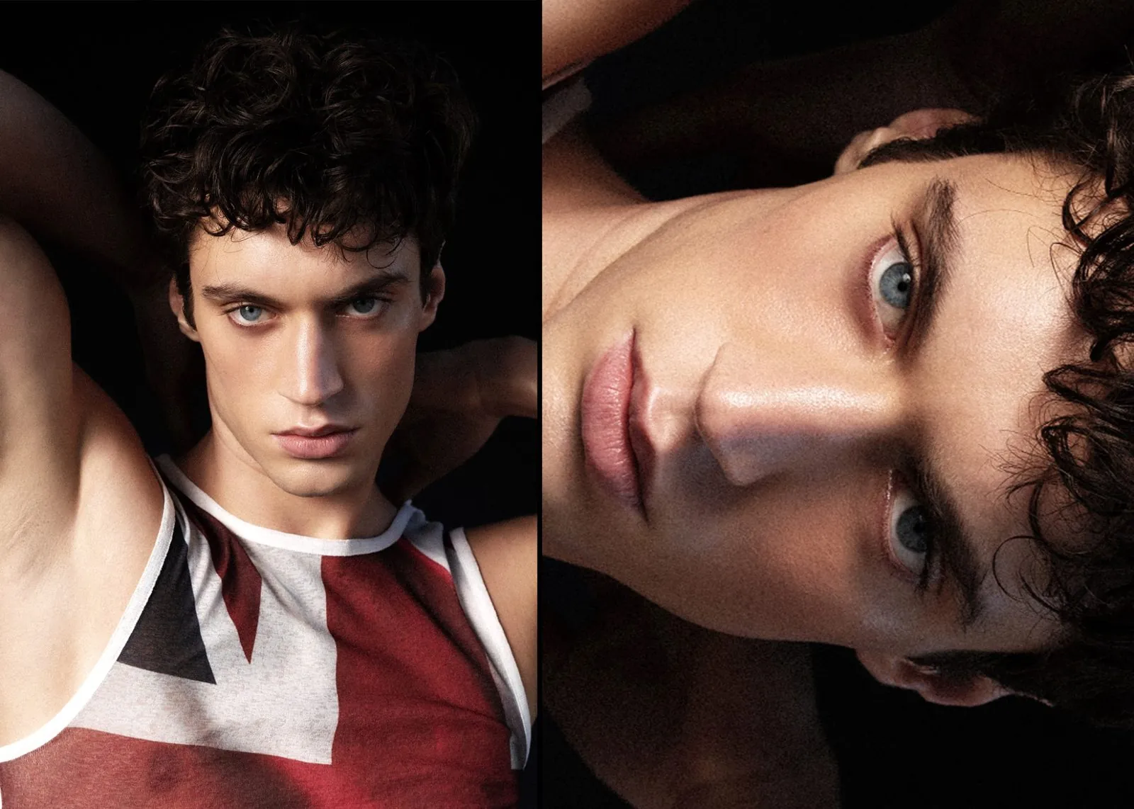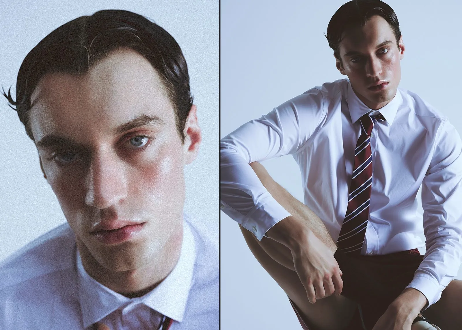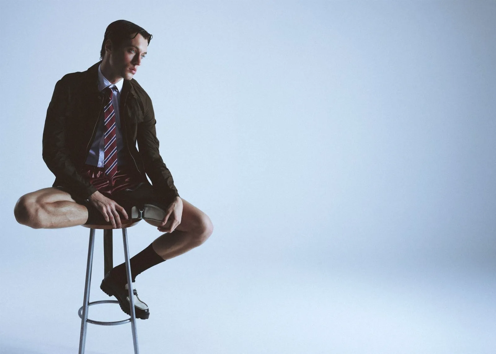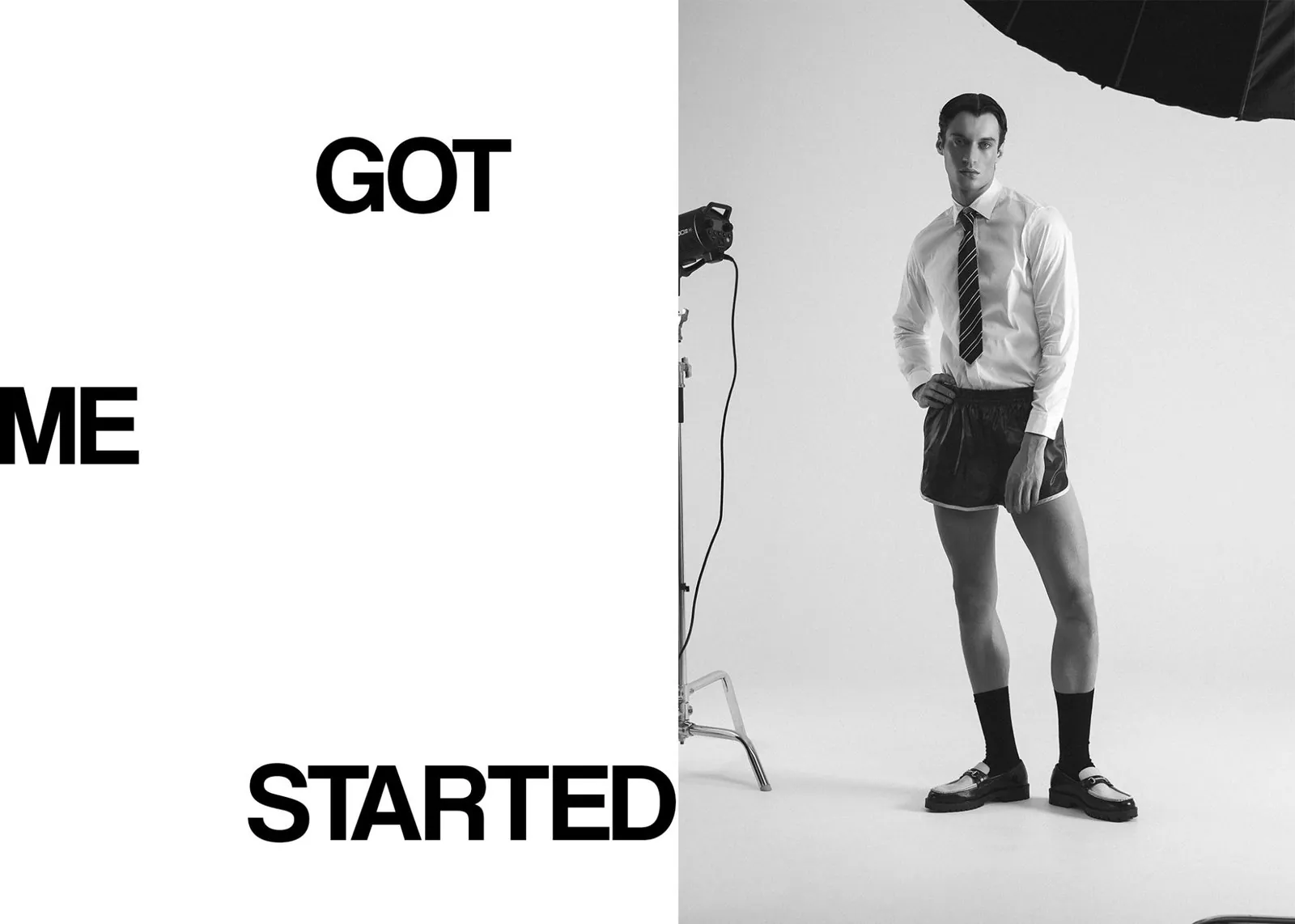 Look 1: Jacket-shirt: AOS concept, Tie: Urban Outfitters, Loafers: Asos Look 2: Wrestling bodysuit: Stylist’s own Look 3: Sweatshirt: ZARA, Boxers: Champion, Loafers: Asos Look 4: Tank top: Urban Outfiters, Jeans: Levi’s