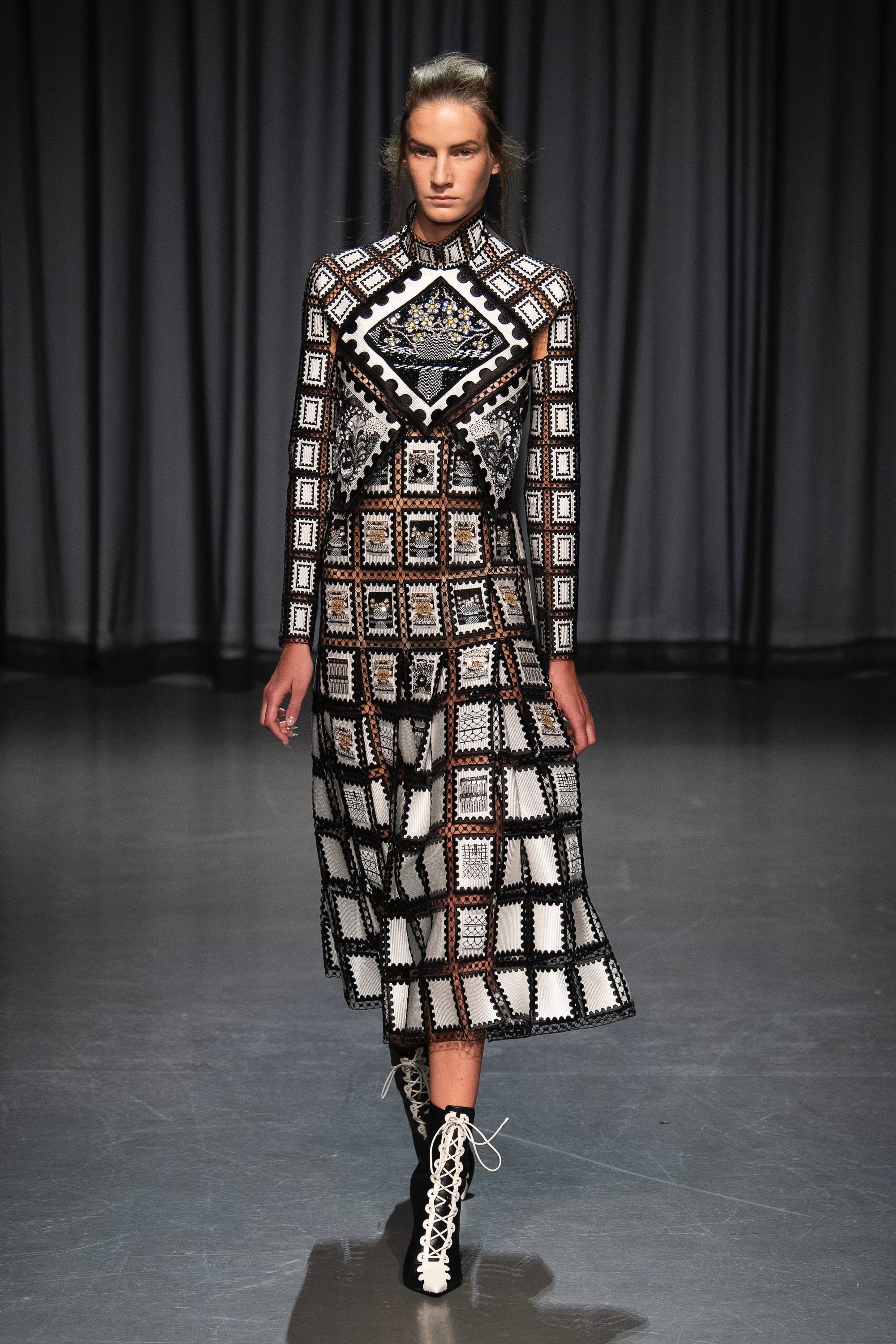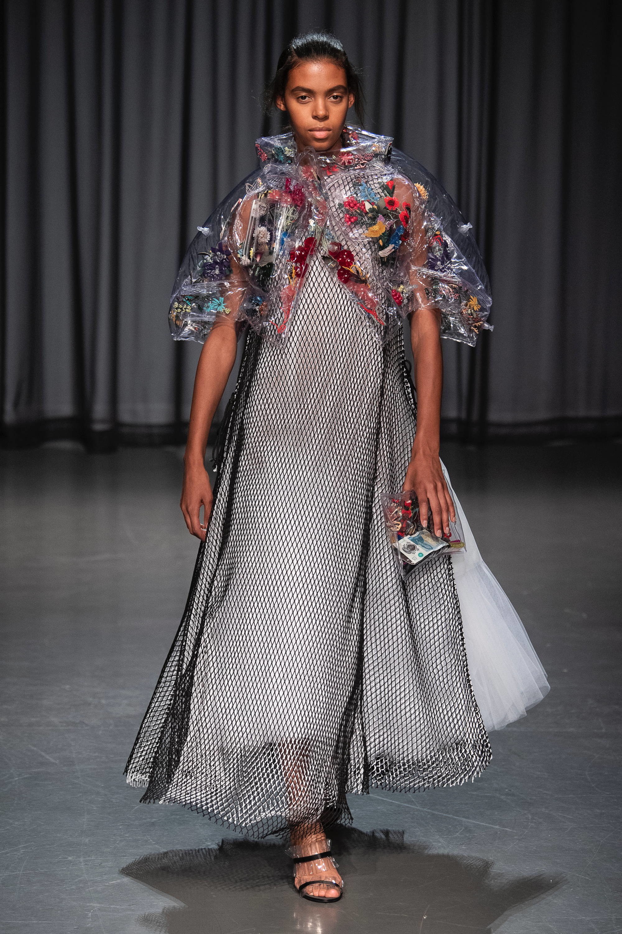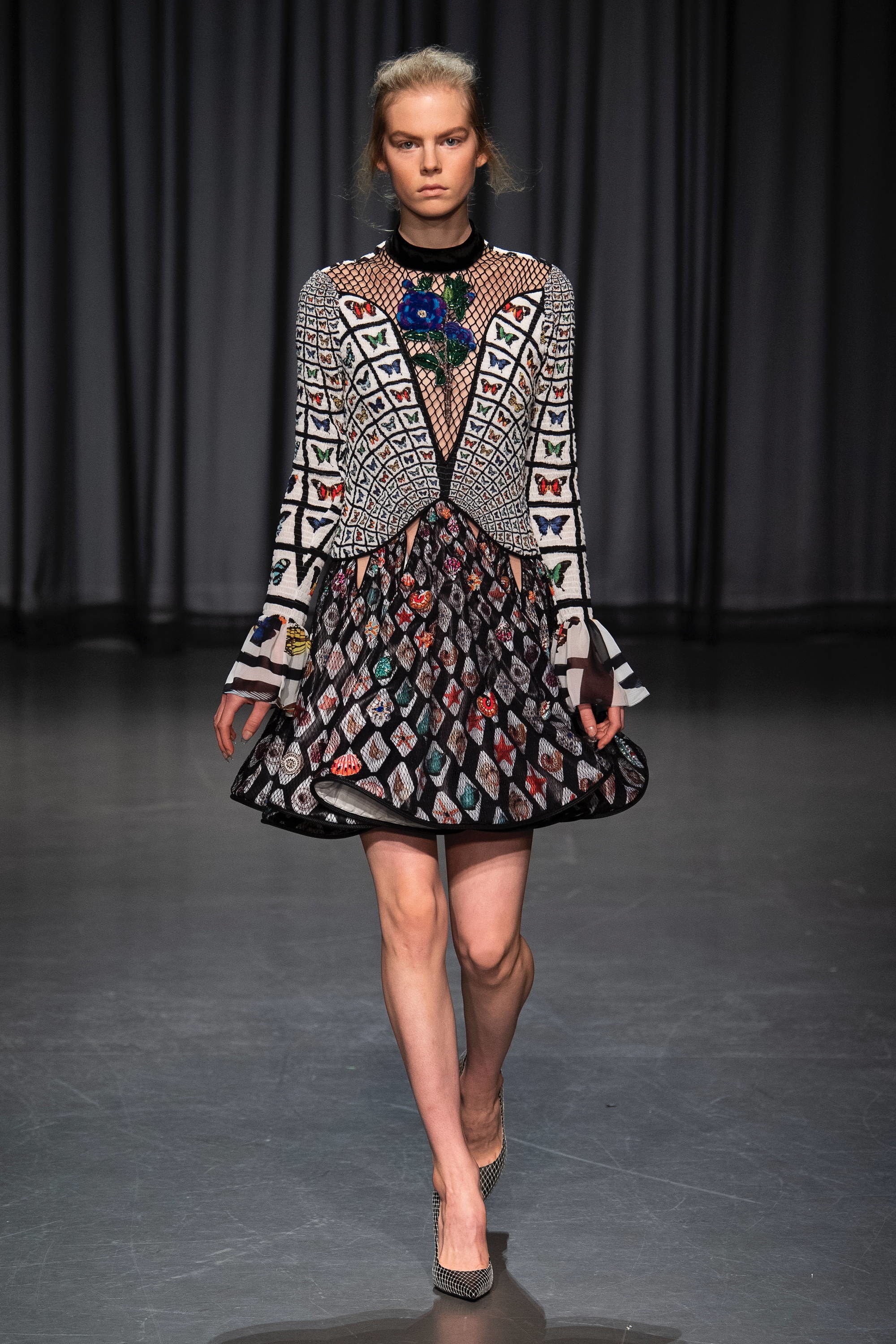 Flashback σε προηγούμενες κολεξιόν της και φρέσκια ματιά! Μερικά κομμάτια της συλλογής παρουσίαζαν γραμματόσημα ενωμένα με διάφανες λεπτομέρειες από δαντέλα ενώ πρωταγωνιστής της βραδιάς ήταν τα φορέματα με ραβδώσεις που αποτύπωναν πεταλούδες και λουλούδια. Τις εντυπώσεις κέρδισε το διάφανο jacket που ήταν στολισμένο με απομιμήσεις από κοράλλια και φύκια σε συνδυασμό με το άσπρο τούλινο φόρεμα που το συνόδευε. Η υπόλοιπη συλλογή ολοκληρώνονταν με έντονες διαφάνειες, πολυτελή υφάσματα και κομψές χρωματικές αντιθέσεις. Απολαύστε όλη τη συλλογή … εδώ!
