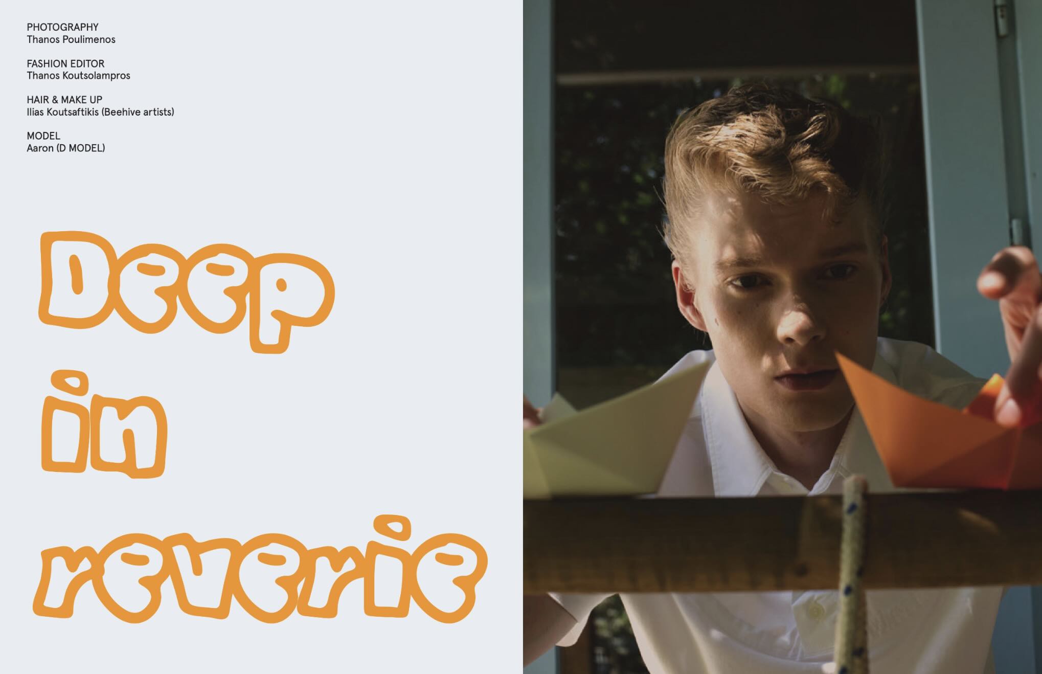 Στο “Deep in Reverie”, η μόδα συναντά τη φαντασία ενός παιδικού δωματίου. Το μοντέλο ποζάρει ανάμεσα σε πολύχρωμα, χάρτινα καραβάκια, σαν να βυθίζεται σε έναν κόσμο ονείρων και αναμνήσεων. Τα ρούχα γίνονται φορείς συναισθημάτων και οι εικόνες θυμίζουν σε όλους μας τη μαγεία του να χάνεσαι για λίγο στις σκέψεις σου.