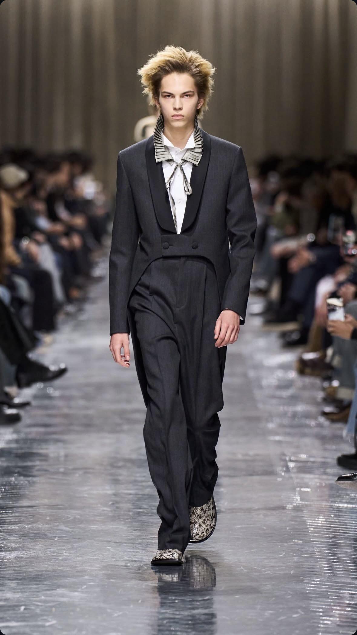 Η FW26 πρόταση του Dior Men αναγεννά την punk rock κουλτούρα μέσα από πληθώρα αναφορών, τόσο στα πατρόν και τις σιλουέτες των ρούχων όσο και στην επιμέλεια του hairstyling και του make-up. Τα μοντέλα κινούνται νωχελικά, σχεδόν άβουλα, στο όριο μεταξύ ζωής και εξάντλησης, με μια διακριτικά αγριεμένη έκφραση που ενισχύει την αίσθηση εσωτερικής σύγκρουσης.