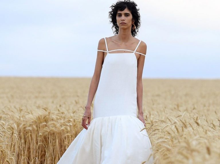 Τα μοντέλα του Jacquemus, φορώντας κομμάτια που σαν να λειτουργούσαν συμπληρωματικά στο τοπίο, περπάτησαν σε μια ξύλινη πασαρέλα μήκους 600 μέτρων, ανάμεσα στο σιτάρι, μπροστά σε καλεσμένους καθισμένους με τις απαραίτητες αποστάσες. Μαλακές σιλουέτες, φυσικά υφάσματα, μια παλέτα ταιριαστή με τη φύση γύρω της, γεμάτη λευκά, μαύρα, χακί, μπεζ, και μερικά παστέλ που έδιναν έμφαση, κυριαρχούσε στη συλλογή, την οποία συμπλήρωναν ενδιαφέροντα αξεσουάρ – χωρίς ίχνος τεράστιου ψάθινου καπέλου, ωστόσο.