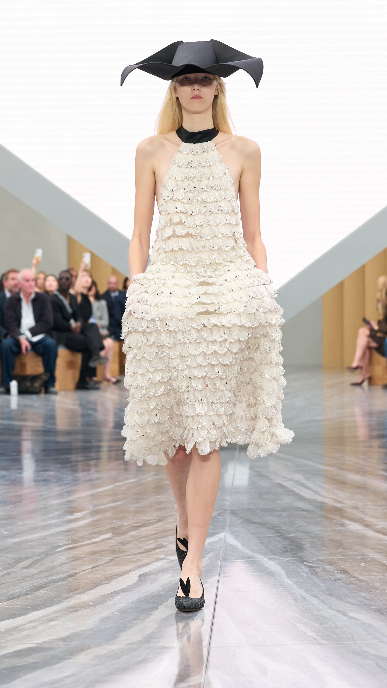Δεν έλειψαν οι θεατρικές υπερβάσεις, όπως oversized καπέλα που θύμιζαν στιλάτες καλόγριες, δαντελένια καλύμματα προσώπου, φούστες-μικρογραφίες από στρώσεις υφάσματος που θύμιζαν μιλφέιγ και άλλα. Ταυτόχρονα, πιο «προσγειωμένα» κομμάτια -όπως μίνι δερμάτινες φούστες, σουέτ τσάντες με ενσωματωμένο μεταλλικό logo και μυτερά pumps με το “C” και το “D” χαραγμένα σε κάθε πόδι -πρόδιδαν την πρόθεση του Anderson να κρατήσει τη συλλογή σε διάλογο με την πραγματικότητα.