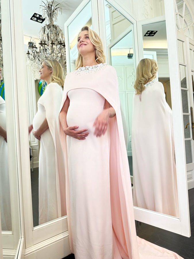 Για τη συγκεκριμένη εμφάνιση, επέλεξε δημιουργία του Οίκου Celia Kritharioti: ένα παλ ροζ μακρύ φόρεμα με χειροποίητη κάπα στην ίδια απόχρωση διακοσμημένη με λουλούδια και κρύσταλλα.