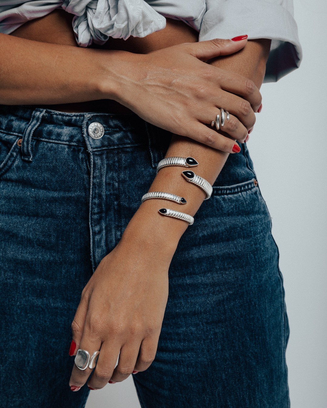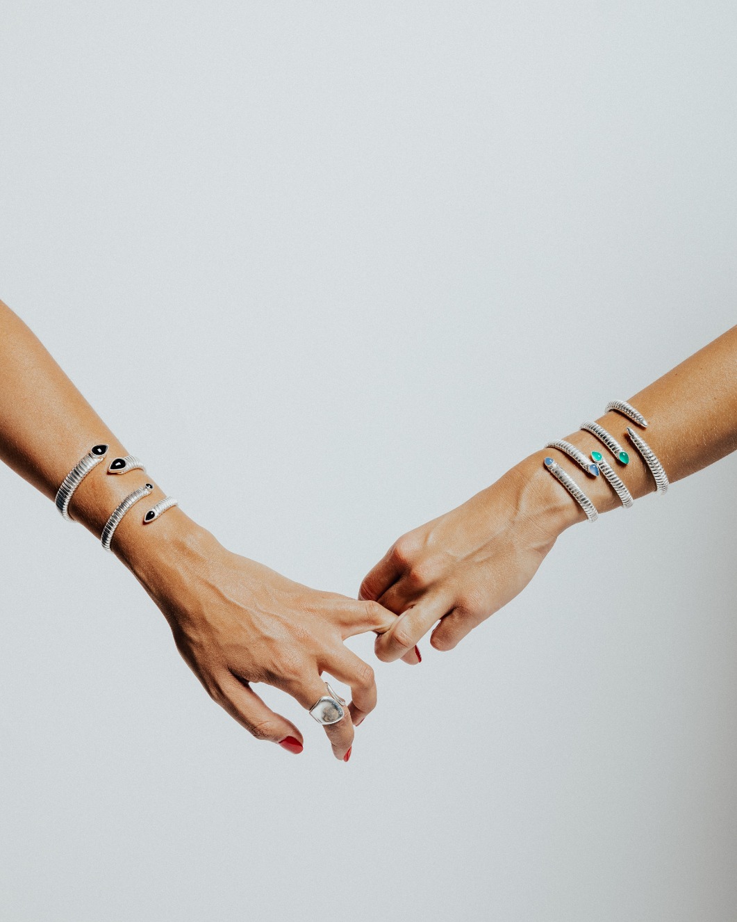 Τα υλικά που χρησιμοποιώ είναι ασήμι 925 και χρυσός Κ14 και Κ18. Οι πολύτιμοι και ημιπολύτιμοι λίθοι είναι ένα στοιχείο που πρόσθεσα στην τελευταία μου συλλογή με τα σπιράλ βραχιόλια και σκέφτομαι να ξαναχρησιμοποιήσω και στο μέλλον.
