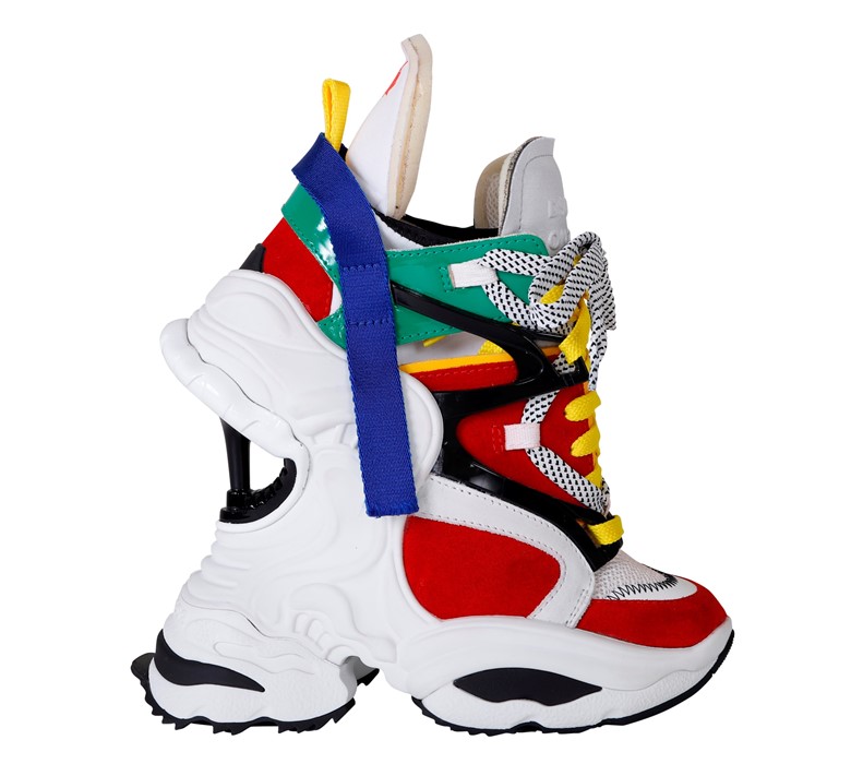 To παπούτσι Dsquared2 GIANT μοιάζει να είναι όχι ένα, αλλά δύο ζευγάρια chunky, 90s-style sports sneakers, όπου το ένα πατάει πάνω στο άλλο. Το ύψος του φαντάζει κάπως τρομακτικό και το brand Dsquared2 δείχνει να μην φοβάται τις υπερβολές, μιας και πολλάκις έχει παρουσιάσει εκκεντρικά παπούτσια στην πασαρέλα.
