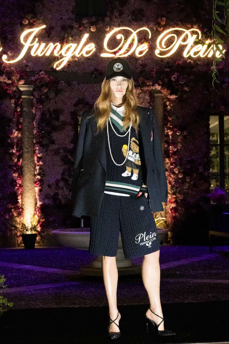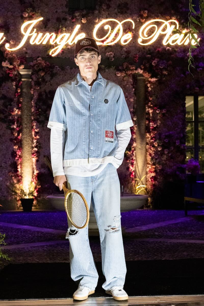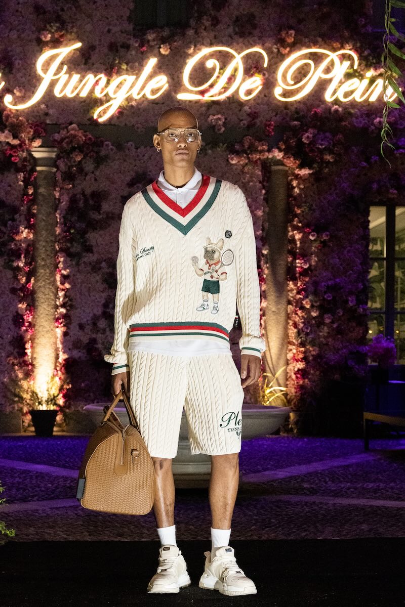 Το menswear επικεντρώνεται σε ανάλαφρα, καλοκαιρινά κοστούμια, συνδυασμένα με denim σε πιο χαλαρή αλλά πάντα κομψή εκδοχή. Η αισθητική εμπλουτίζεται με playful λεπτομέρειες, όπως ρακέτες τένις, ενώ τα βραδινά looks φέρουν τη χαρακτηριστική, τολμηρή υπογραφή του Philipp Plein.