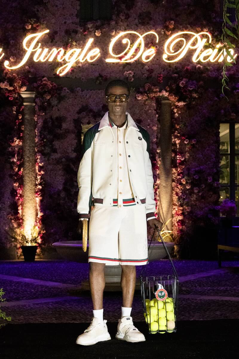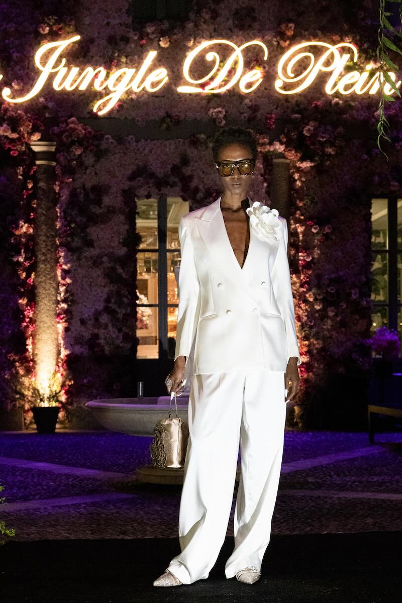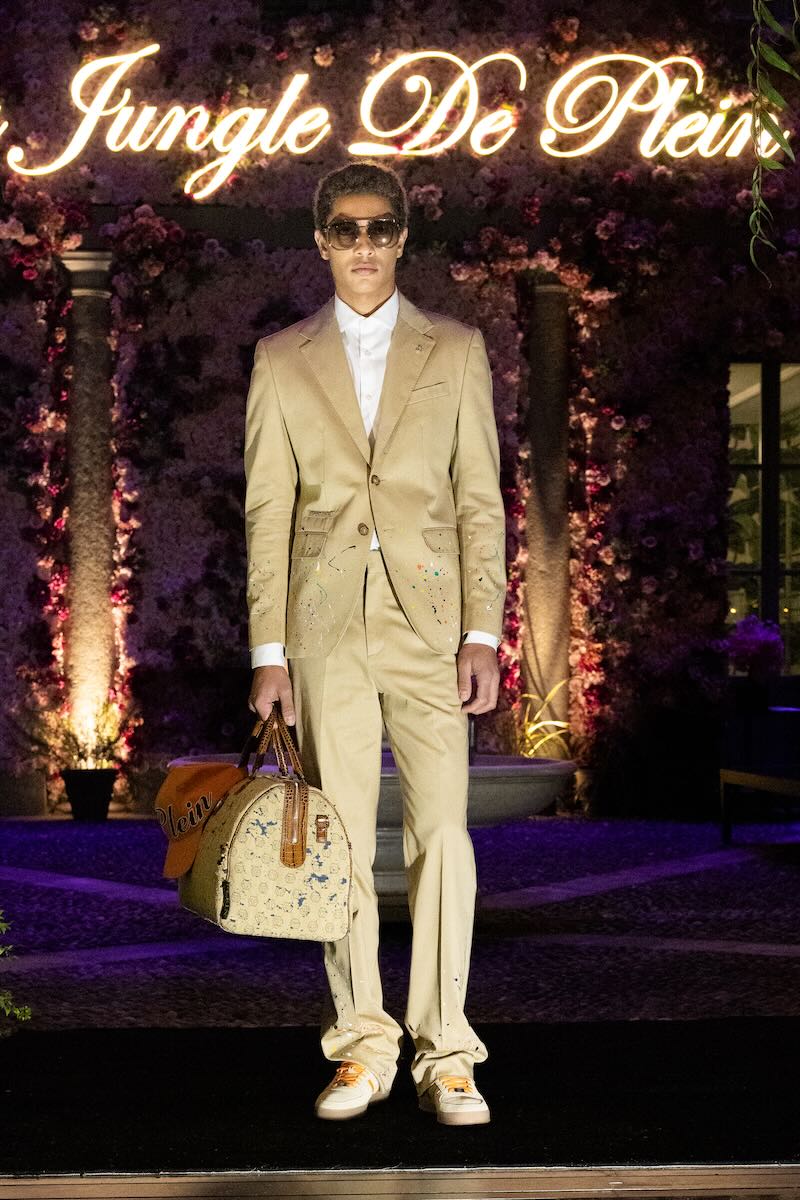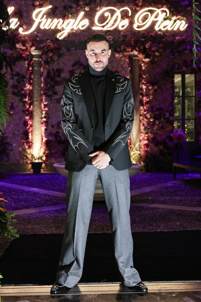 Το menswear επικεντρώνεται σε ανάλαφρα, καλοκαιρινά κοστούμια, συνδυασμένα με denim σε πιο χαλαρή αλλά πάντα κομψή εκδοχή. Η αισθητική εμπλουτίζεται με playful λεπτομέρειες, όπως ρακέτες τένις, ενώ τα βραδινά looks φέρουν τη χαρακτηριστική, τολμηρή υπογραφή του Philipp Plein.