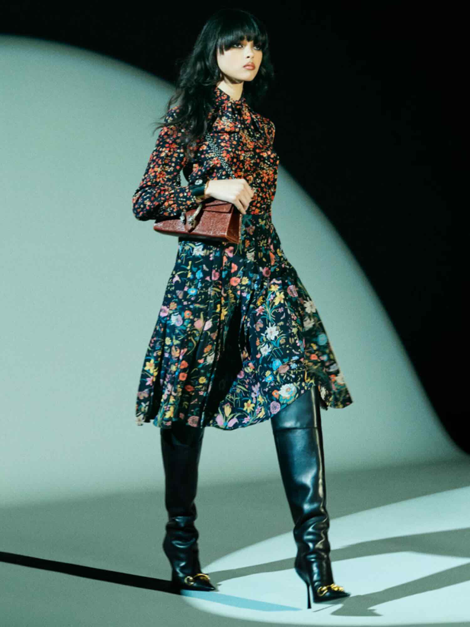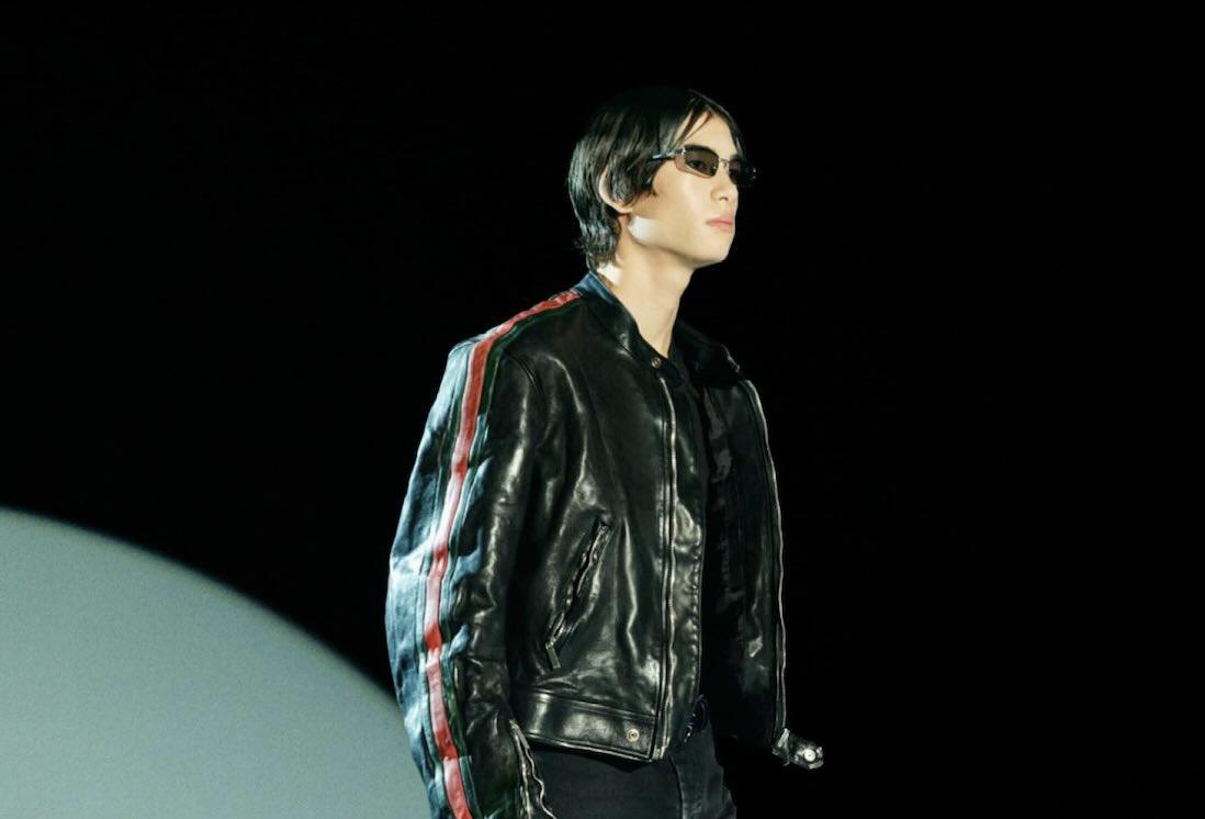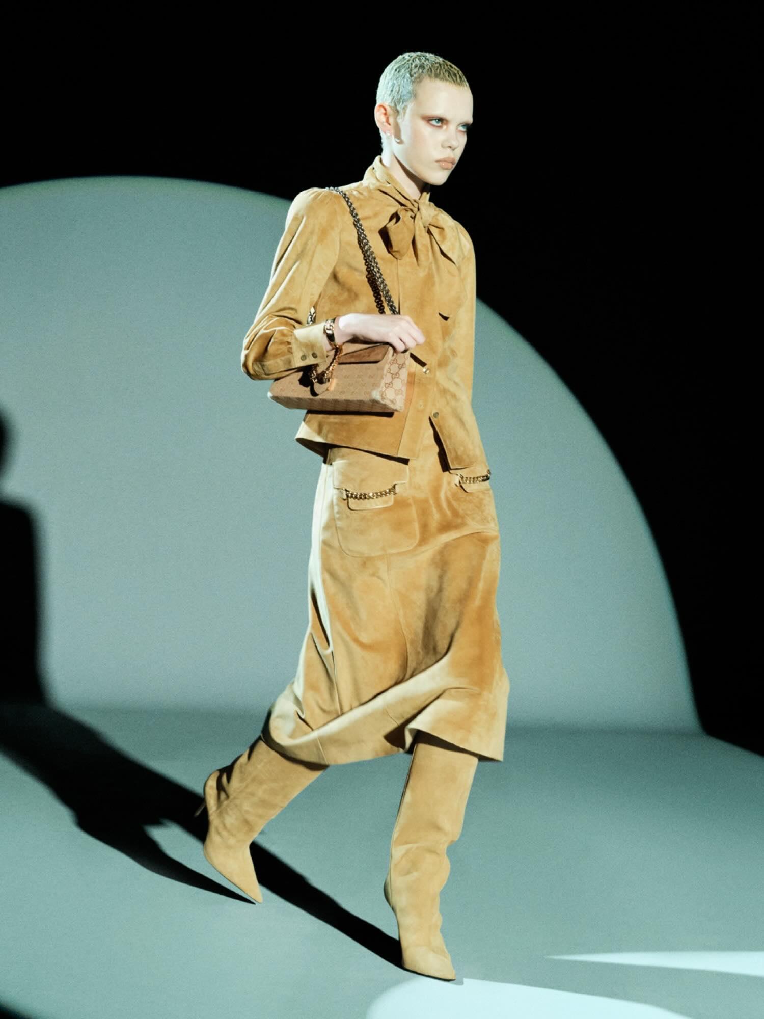 Ο Demna ανανεώνει εμβληματικά στοιχεία από τα ’70s και τα ’90s με racer jackets και Web stripe, ζώνες με «κομμένη» εκδοχή του Double G, total δερμάτινα looks και ιππικά σύνολα εμπνευσμένα από αρχειακά μεταξωτά μαντήλια του οίκου.