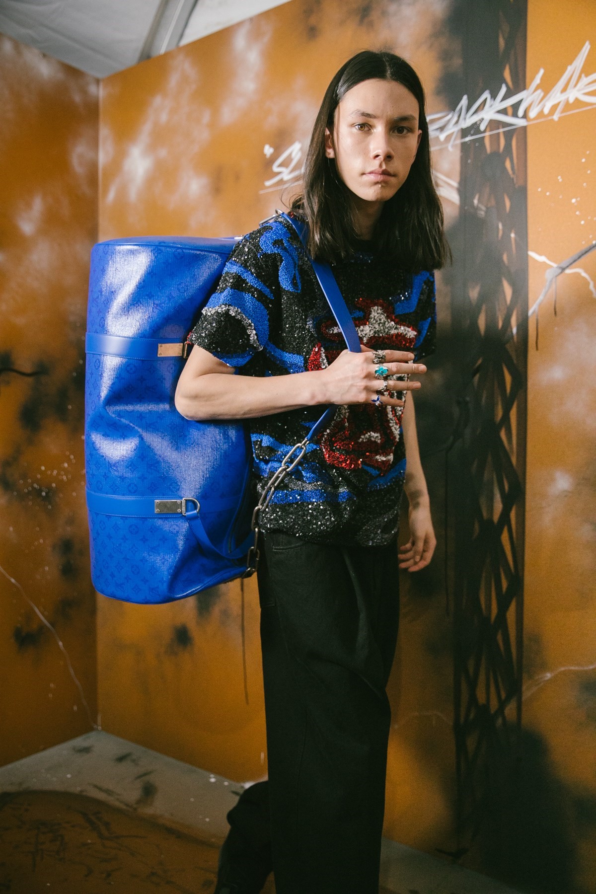Τα φώτα χαμήλωσαν και μια ομάδα από μοντέλα βγήκε, κρατώντας βαλίτσες με φως, που είχαν δημιουργηθεί σε συνεργασία με την Rimowa. Οι τσάντες που είχαν κατασκευαστεί με σειρά από οπτικές ίνες άλλαζαν χρώματα, φωτίζοντας το μονόγραμμα της Louis Vuitton. Στα πόδια τους φορούσαν φουτουριστικά trainers, στα οποία έλαμπε μία το logo LV και μία το Game Over.