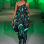 Και τα ρούχα της σχεδιάστριας όμως έχουν κάτι δυστοπικό και σκοτεινό. Στην κολεξιόν της κυριάρχησαν δερμάτινα υφάσματα, φουσκωτά πανωφόρια, αξεσουάρ που έκρυβαν σχεδόν ολόκληρο το κεφάλι, ζώνες από αλυσίδες και αντικαθεστωτικοί μπερέδες. Το πράσινο χρώμα, που είναι διάσπαρτο σε πολλά από τα ρούχα, θυμίζει δηλητήριο και το όλο concept παραπέμπει σε έναν κόσμο όπου η ανθρωπότητα παλεύει να επιβιώσει μετά από πυρηνική καταστροφή.
