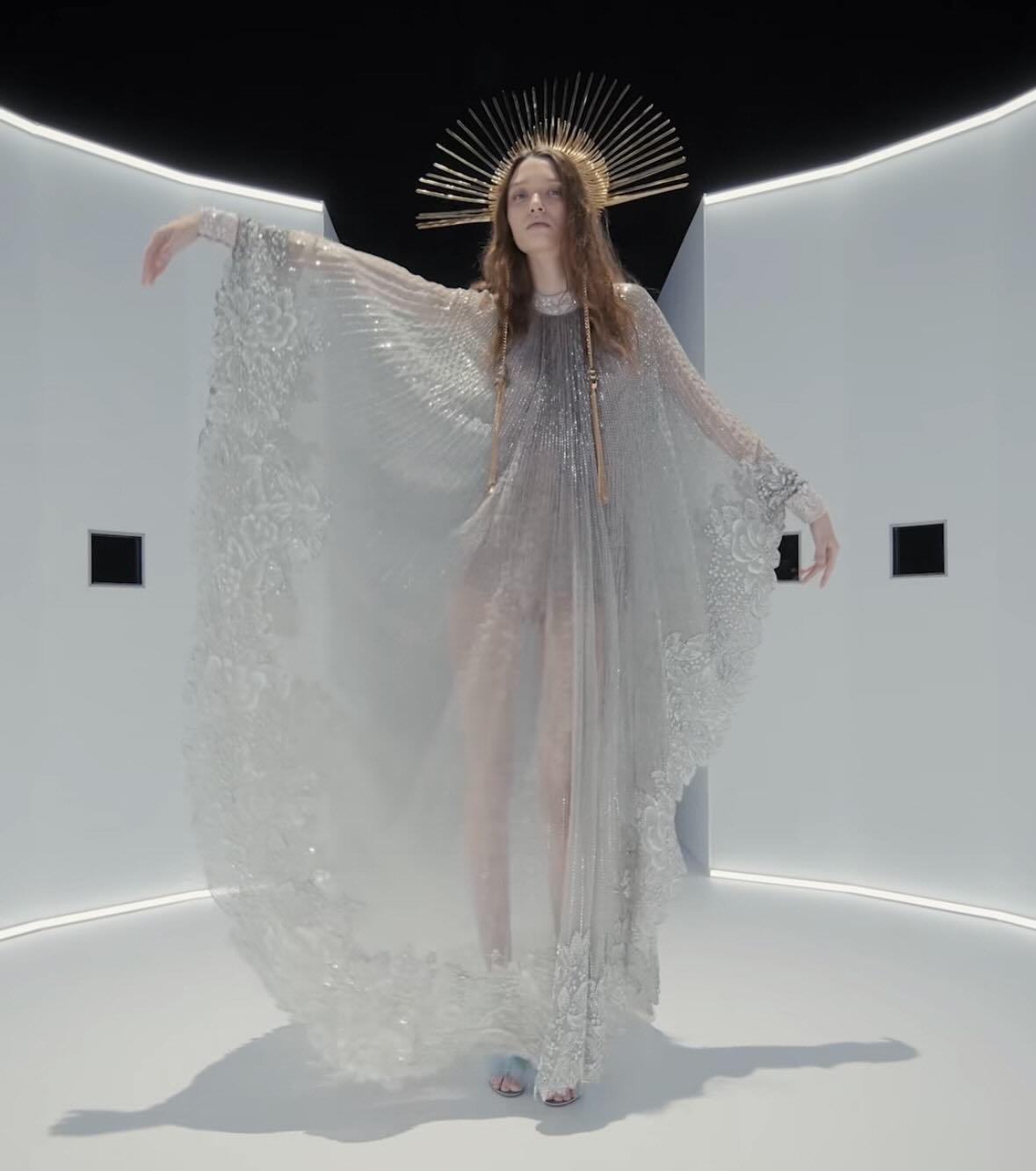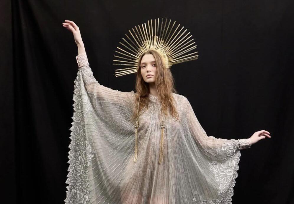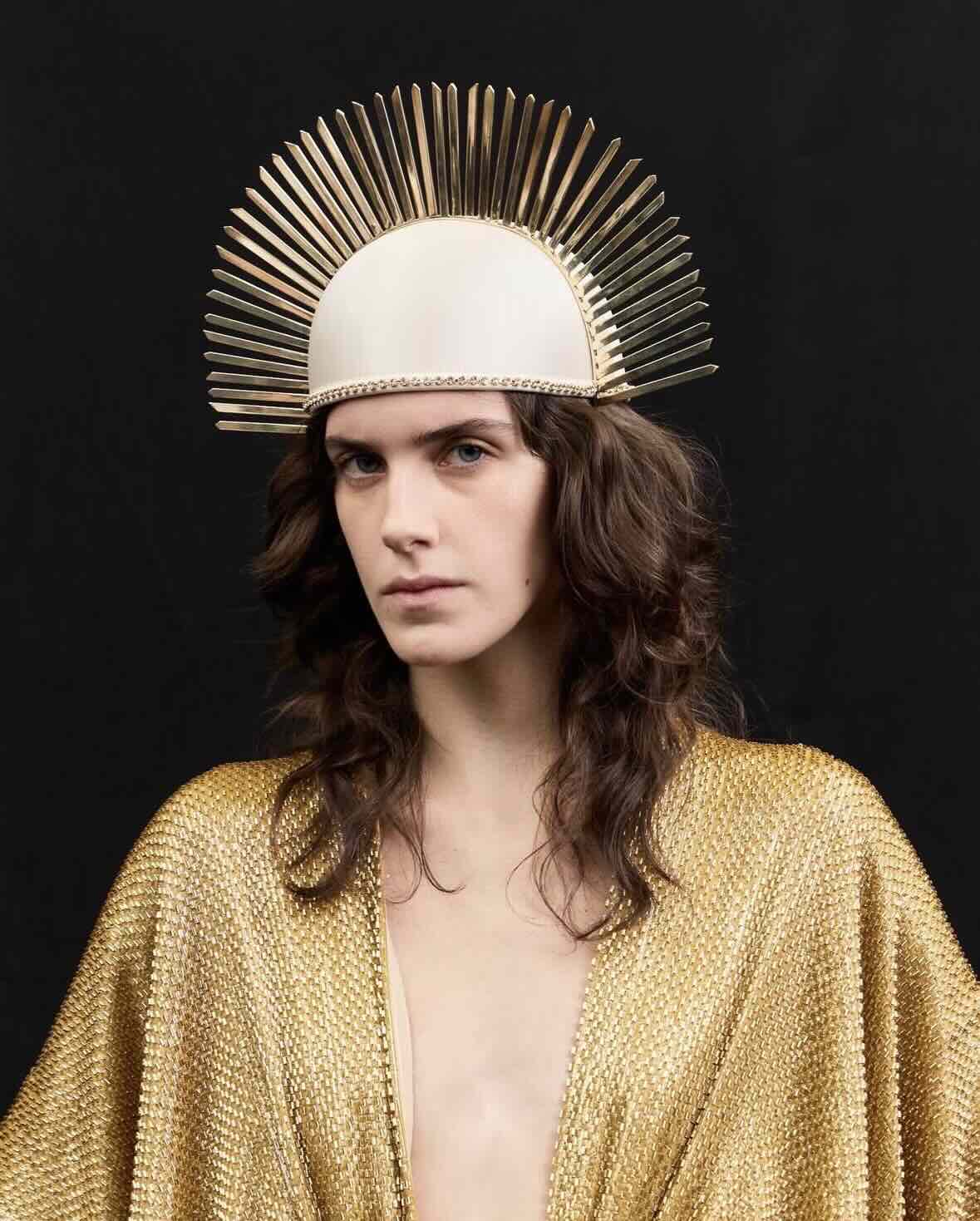 Χρυσές περικεφαλαίες παραπέμπουν σε έναν άλλοτε θεό — τον Απόλλωνα, θεό του φωτός, της αρμονίας και των τεχνών. Βολάν σε γιακάδες και σακάκια, γούνινες λεπτομέρειες, φτερά που αναδύονται στις πλάτες, απαστράπτοντα headpieces: όλα λειτουργούν ως απόηχοι μιας κινηματογραφικής υστεροφημίας, που διατρέχει τις δεκαετίες του ’30, του ’40 και του ’50.