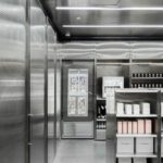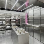 Βασικά στοιχεία ο ανοξείδωτος χάλυβας και τα ράφια, τα οποία περιβάλλουν πλήρως την περίμετρο του καταστήματος. Ο ανοξείδωτος χάλυβας, που μοιάζει κάπως αποστειρωμένος, ξαναγεννιέται με την επίστρωση διάφορων φινιρισμάτων.